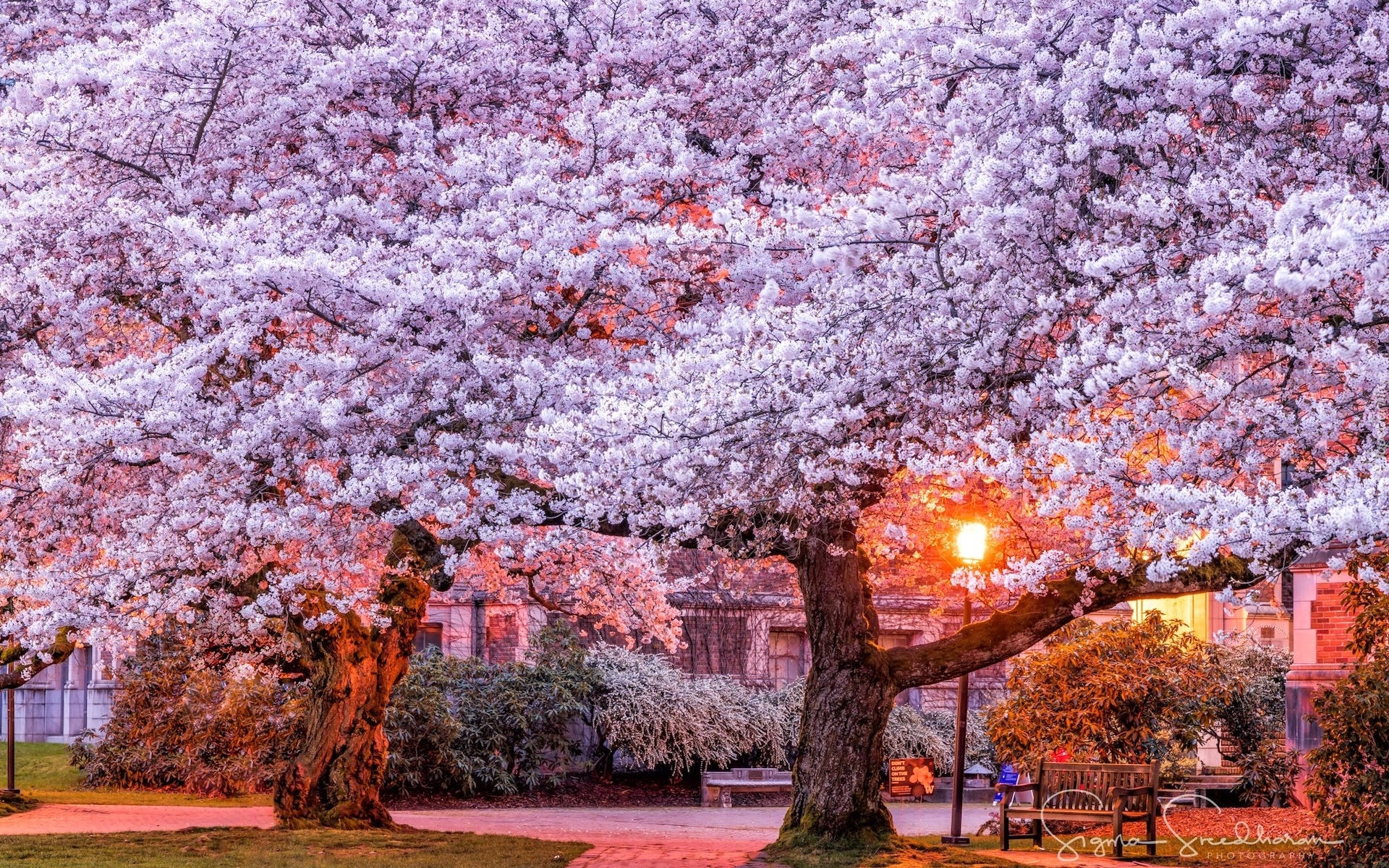 Edytor tapety: Latarnia przy kwitnących drzewach wiśni