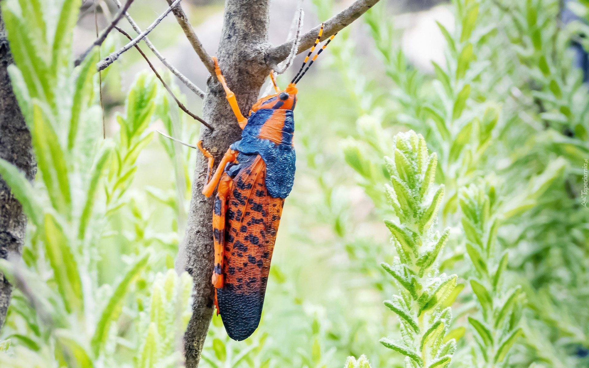 Edytor tapety: Kolorowy konik polny na suchej gałązce