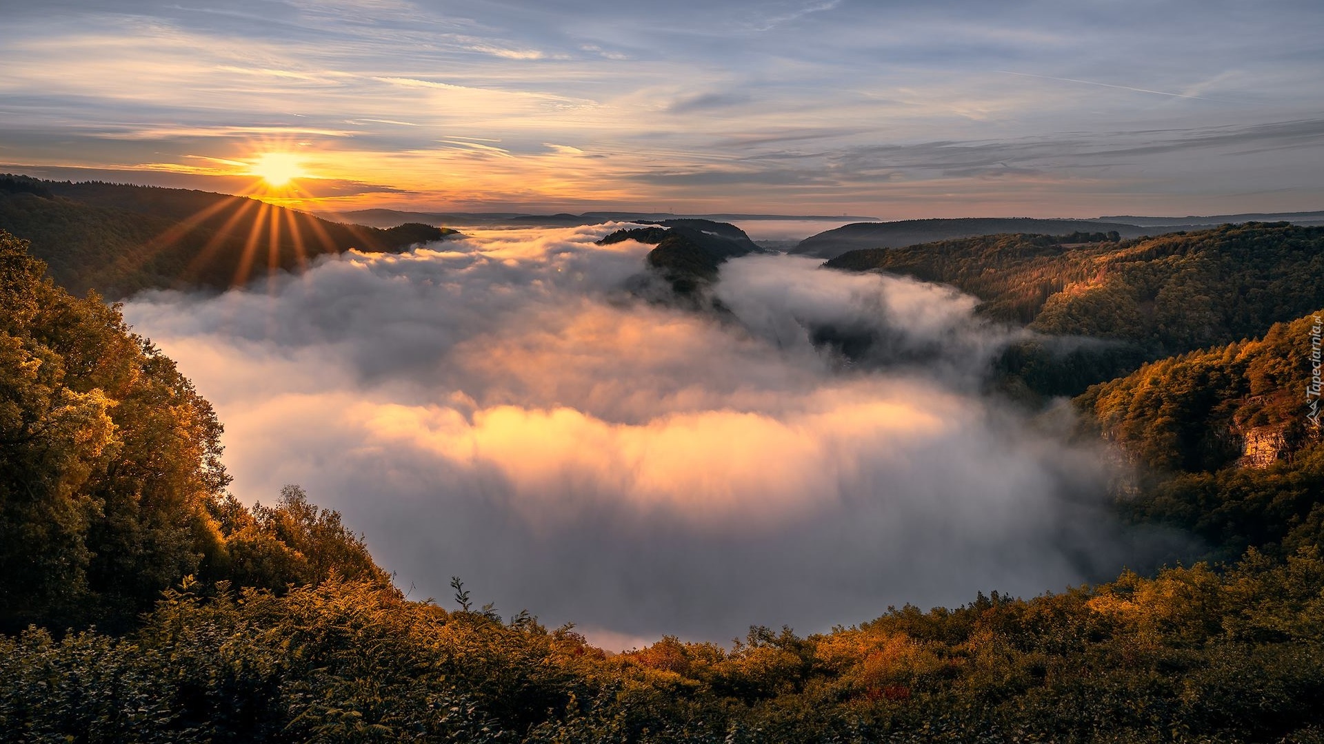 Edytor tapety: Gęsta mgła w górach oświetlona promieniami słońca
