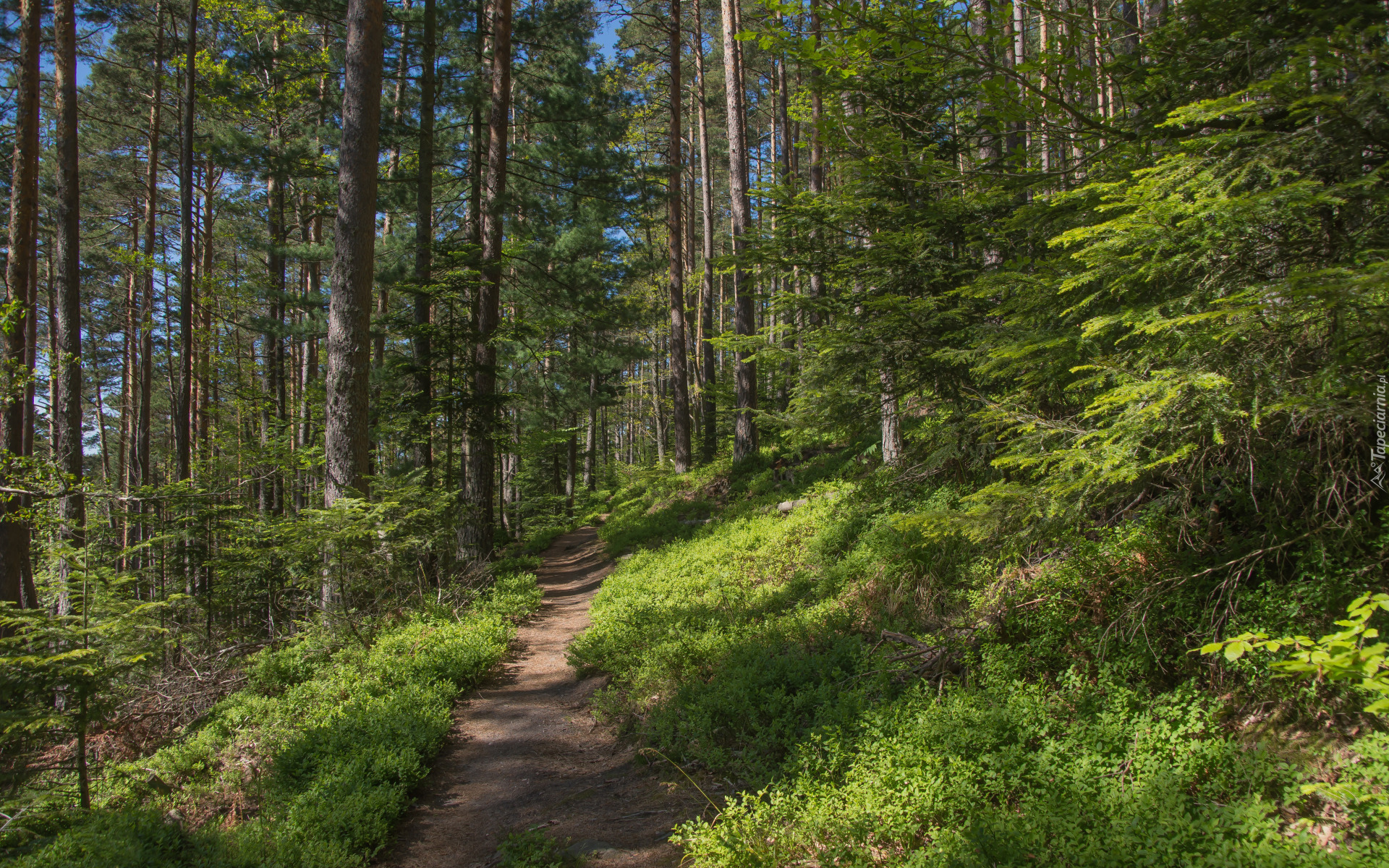 Edytor tapety: Rozświetlone drzewa przy ścieżce w zielonym lesie