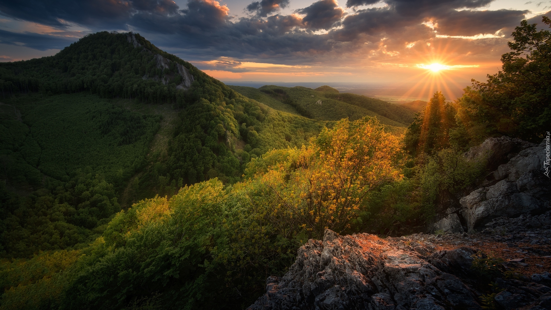 Edytor tapety: Zalesione góry w promieniach wschodzącego słońca