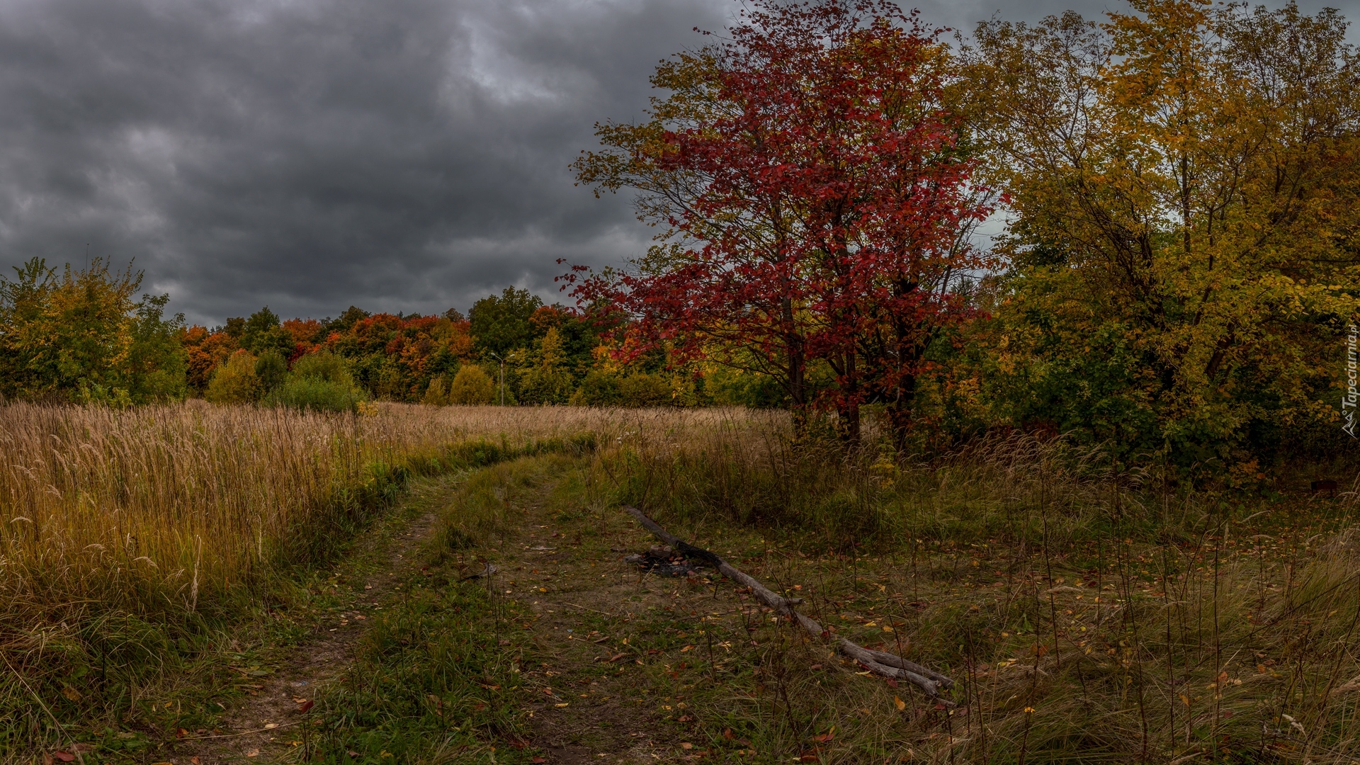 Edytor tapety: Jesienne drzewa przy polnej ścieżce pod ciemnymi chmurami