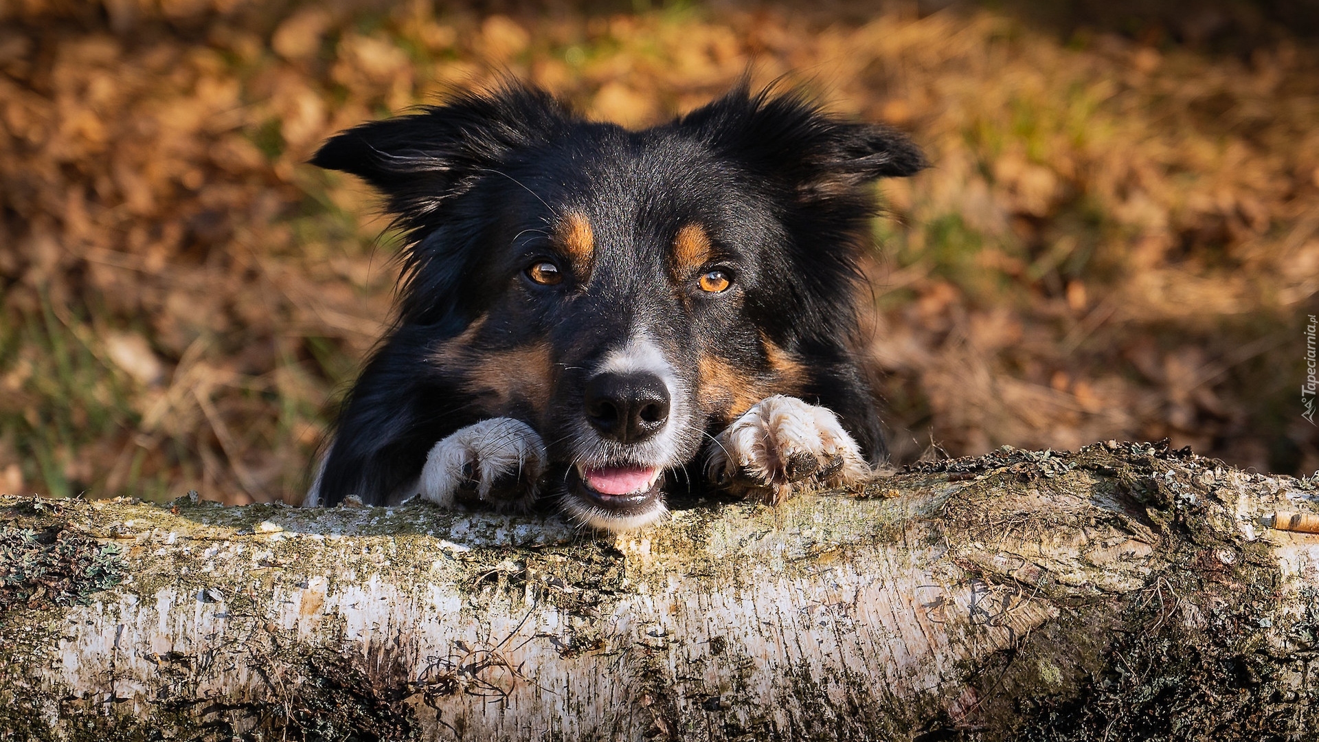 Edytor tapety: Border collie oparty o pień drzewa