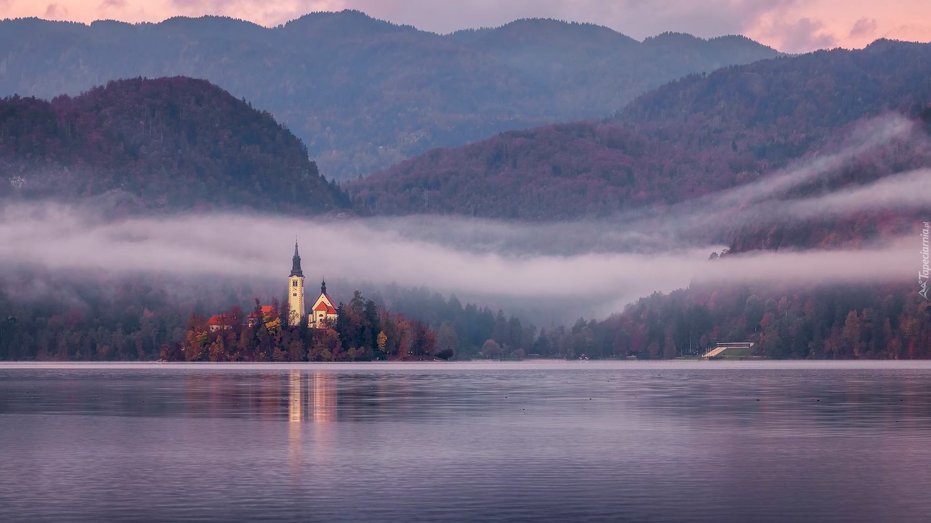 Edytor tapety: Kościół na wyspie Blejski Otok we mgle