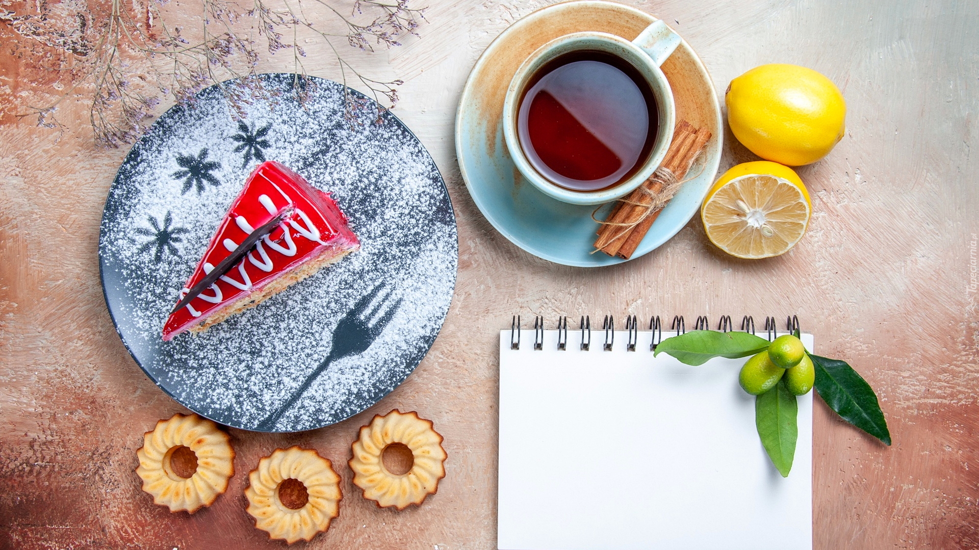 Edytor tapety: Filiżanka herbaty i kawałek ciasta na talerzu