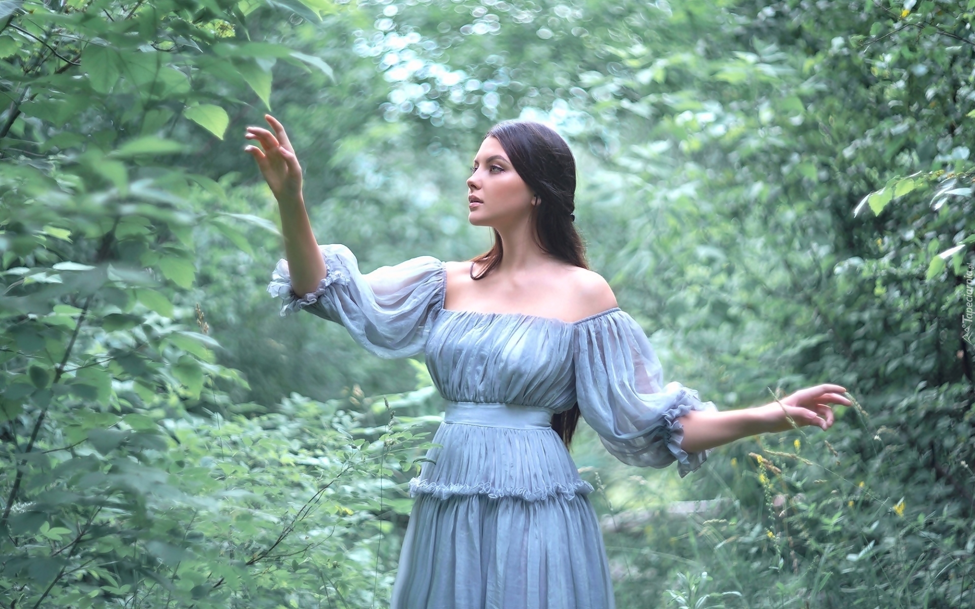 Edytor tapety: Kobieta w niebieskiej sukience wśród drzew