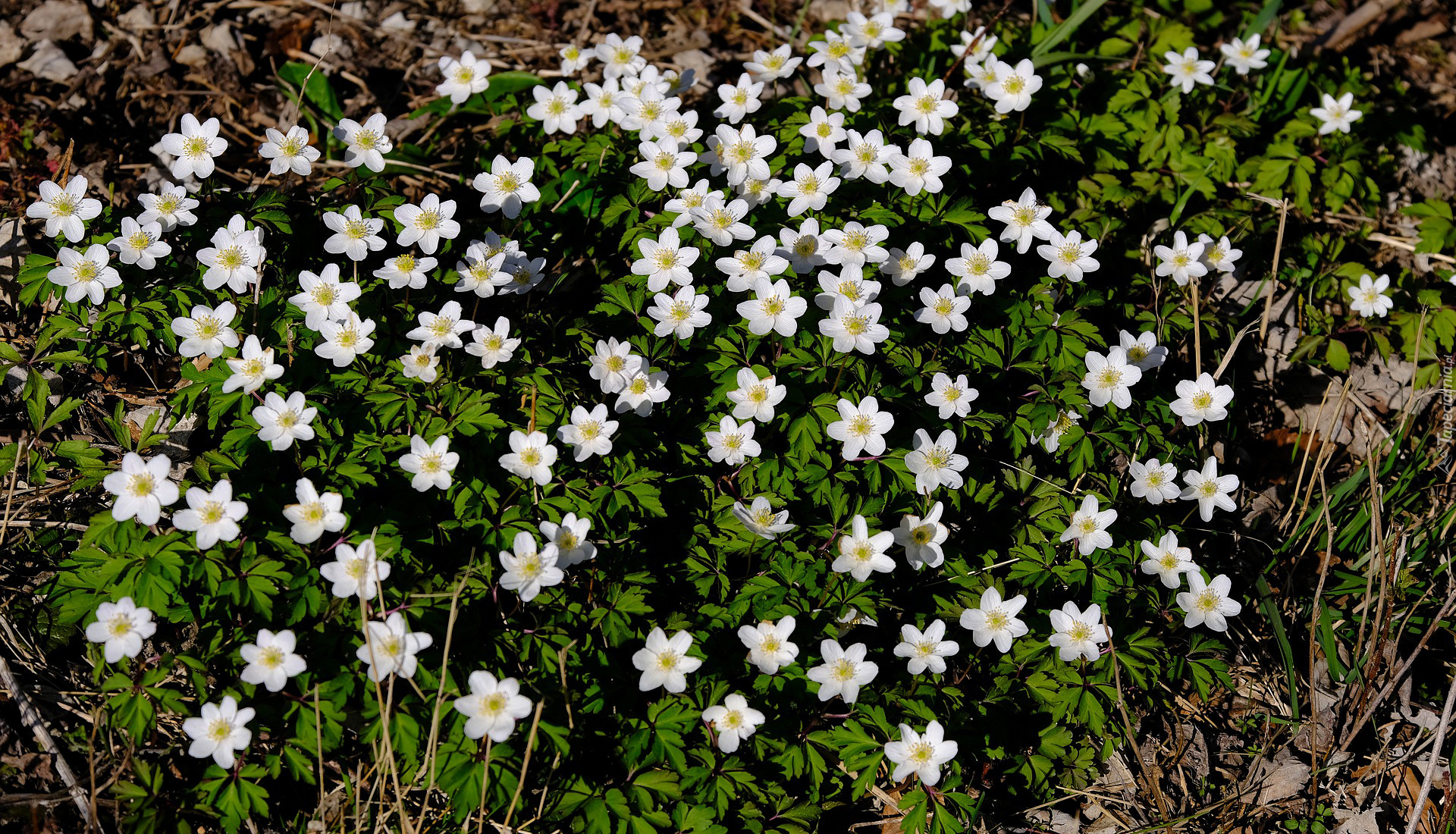 Edytor tapety: Białe zawilce gajowe w trawie