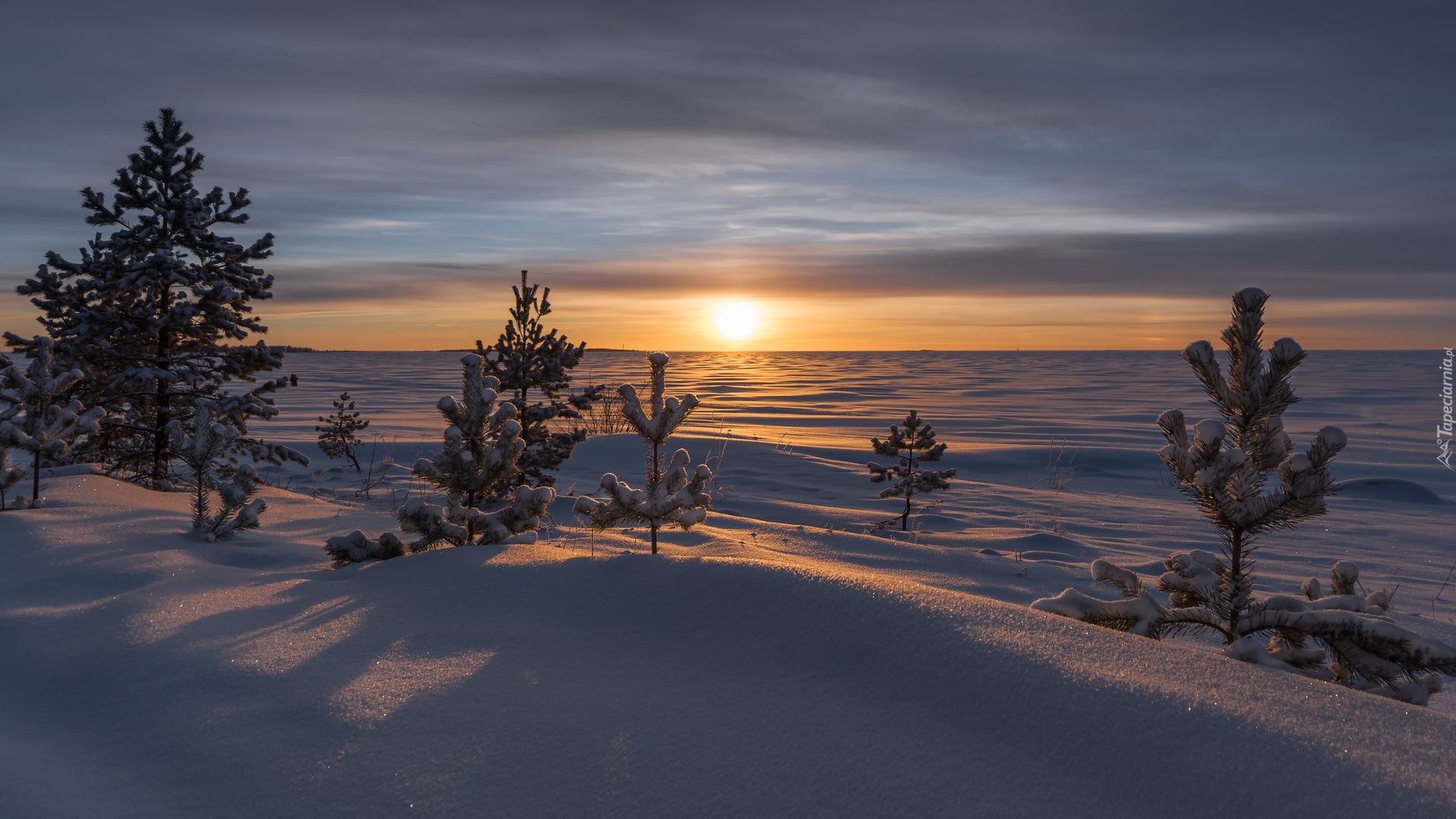 Edytor tapety: Sosny w śniegu na tle wschodzącego słońca