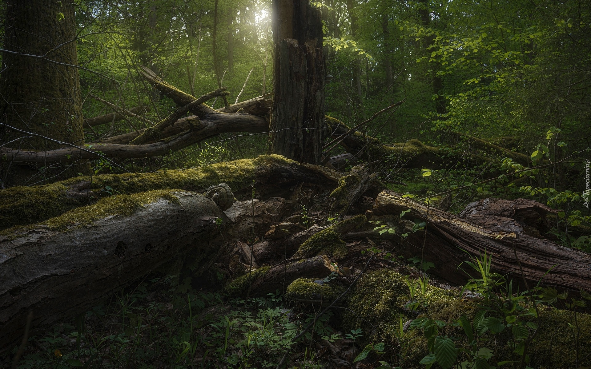 Edytor tapety: Połamane konary i drzewa w lesie
