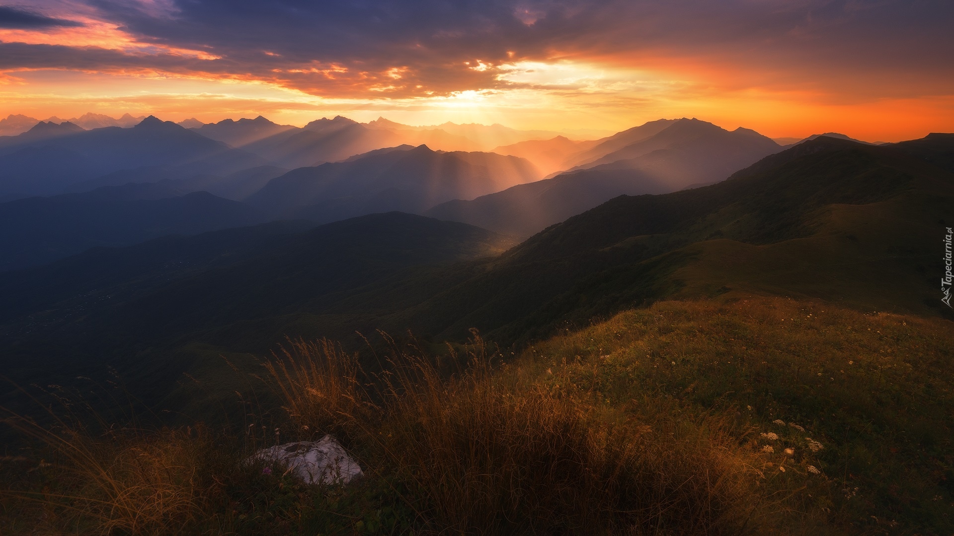 Edytor tapety: Promienie słońca przebijające zza chmur nad górami