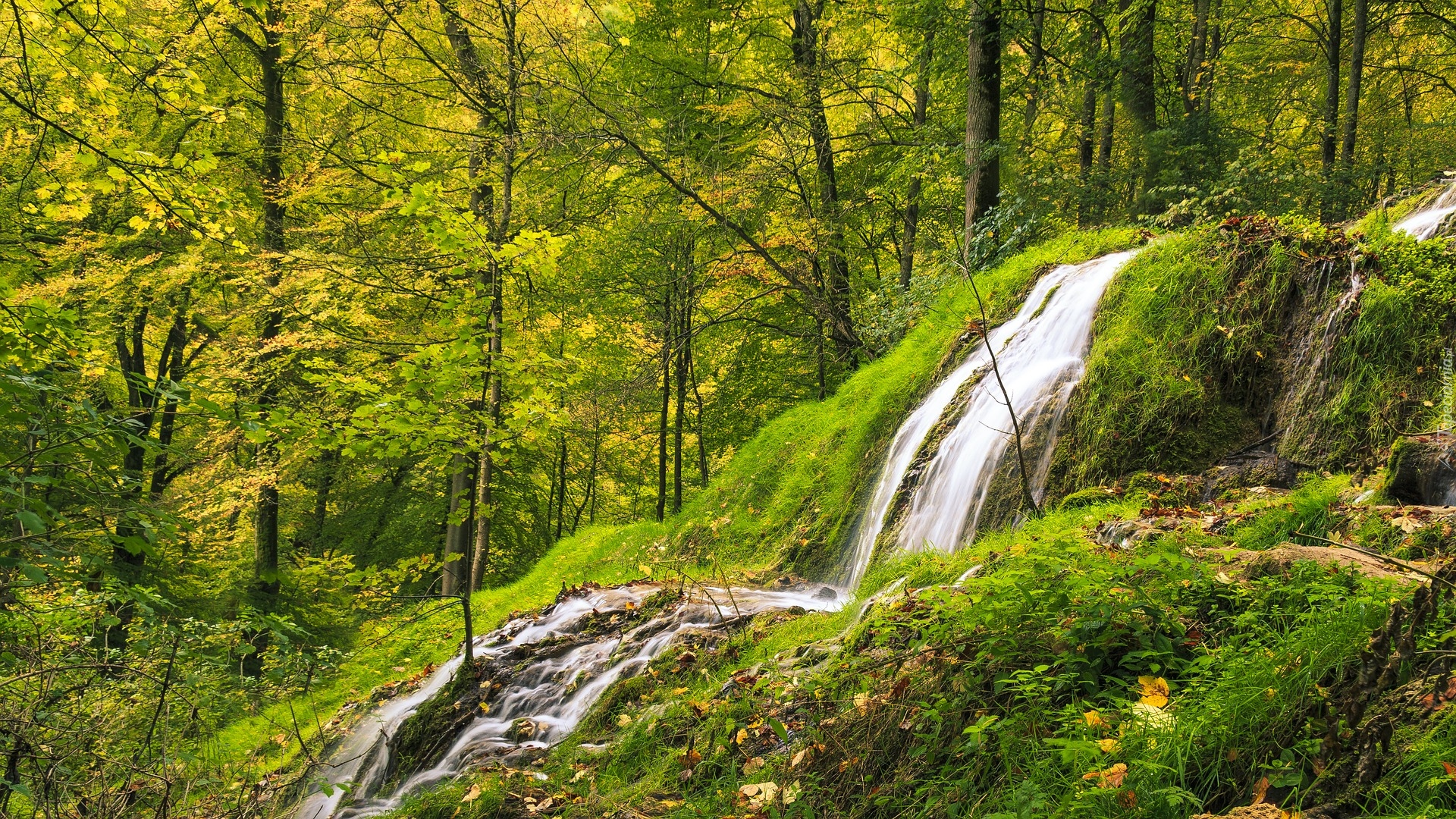 Edytor tapety: Wodospad na porośniętych skałach