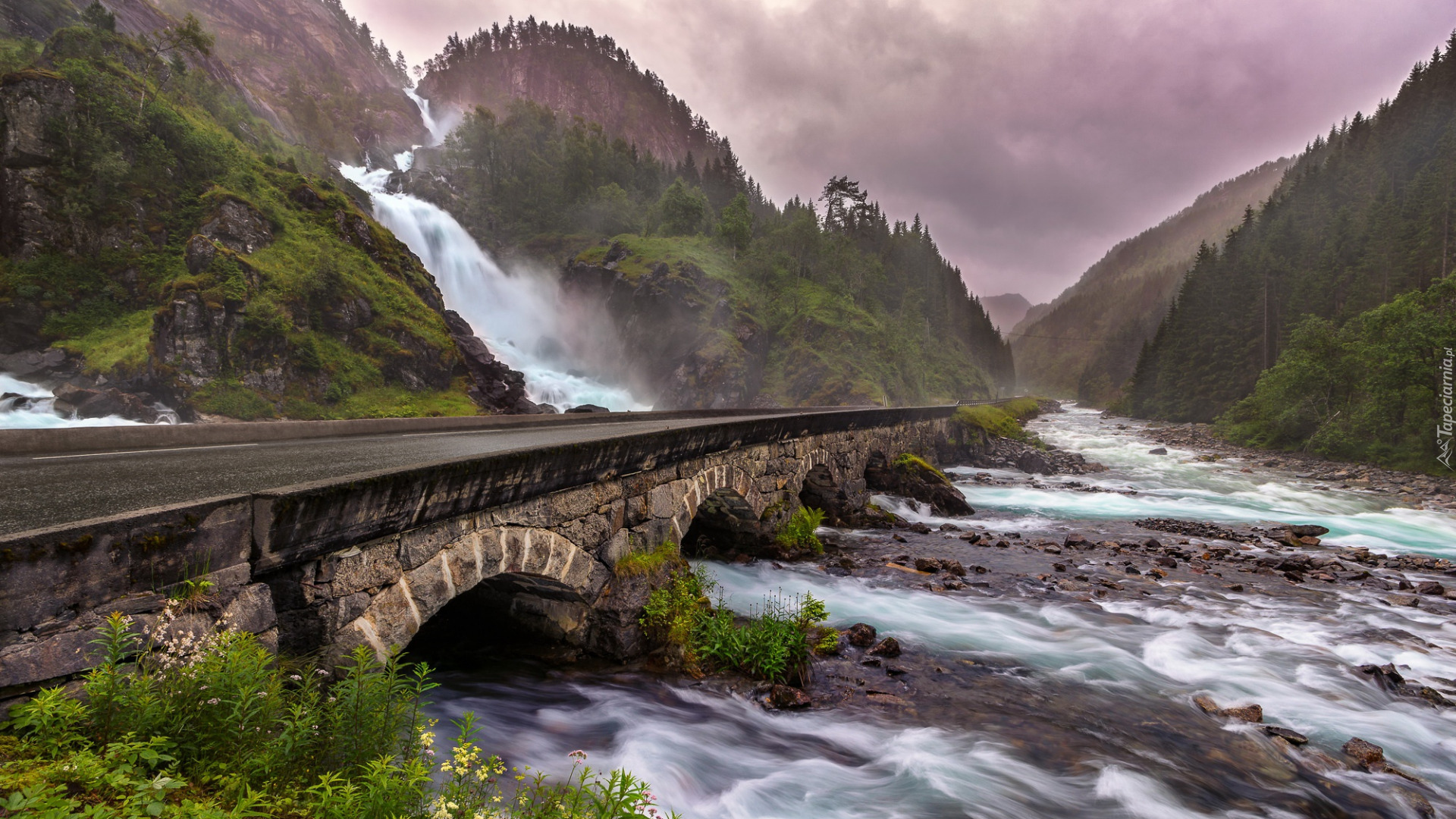 Edytor tapety: Most na rzece przy wodospadzie Latefossen w Norwegii