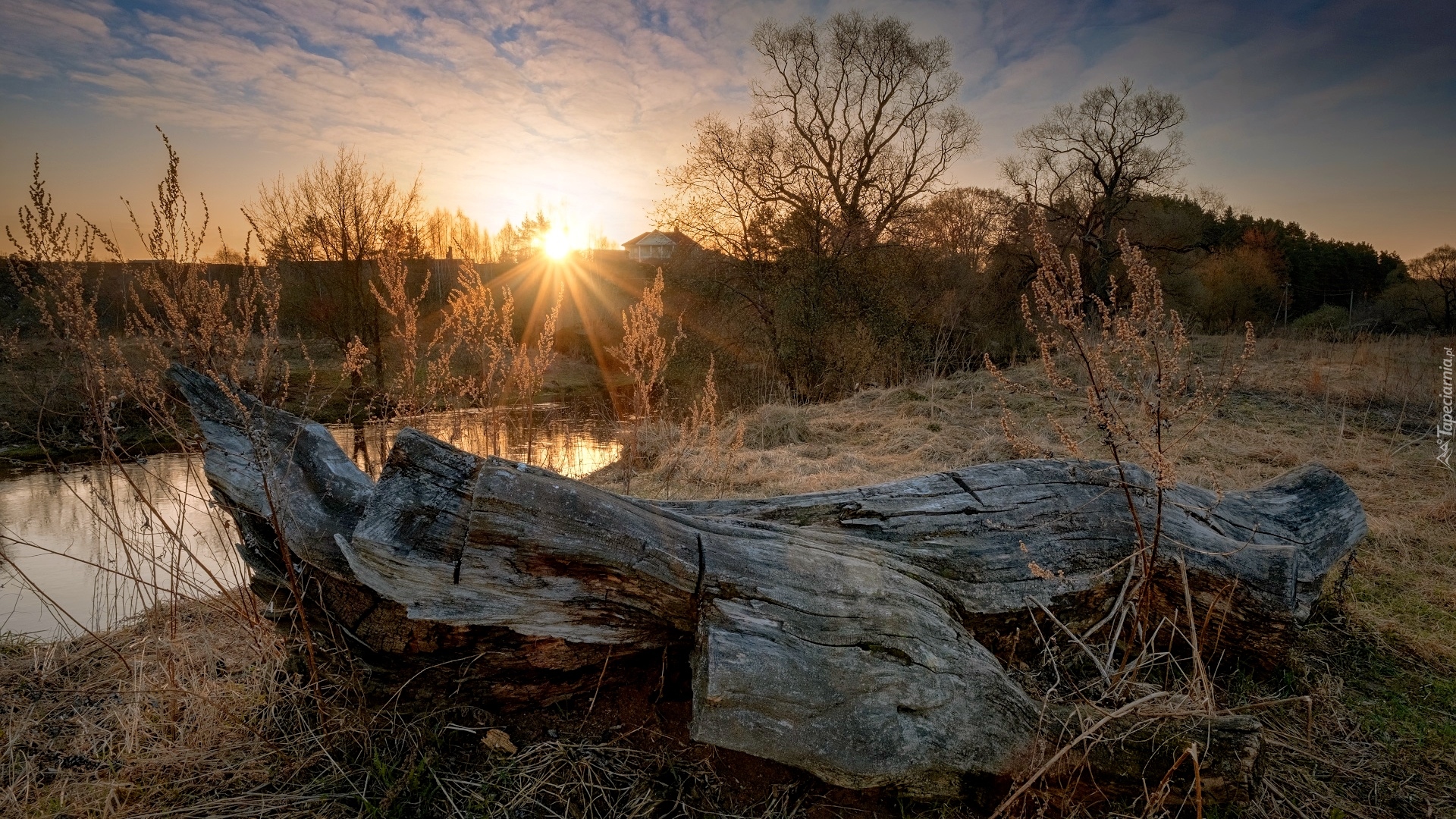 Edytor tapety: Suchy pień drzewa na brzegu rzeki
