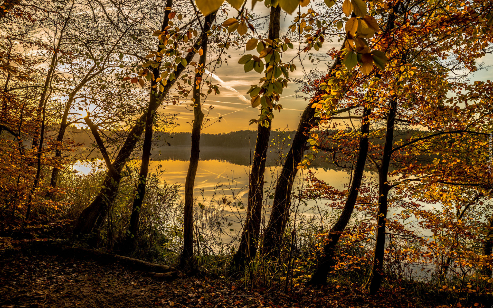 Edytor tapety: Pożółkłe drzewa nad brzegiem jeziora