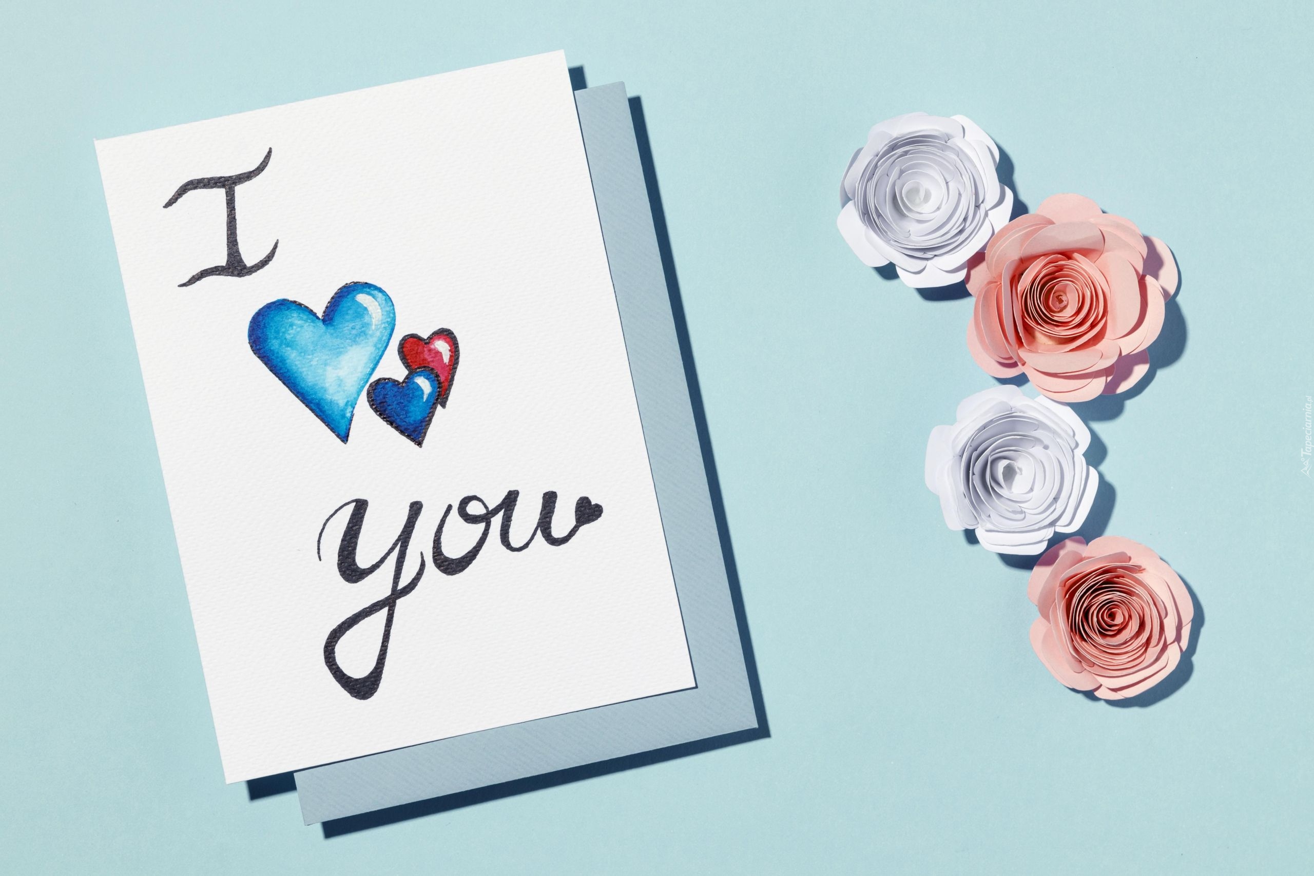 Edytor tapety: Kartka z wyznaniem miłosnym obok papierowych róż