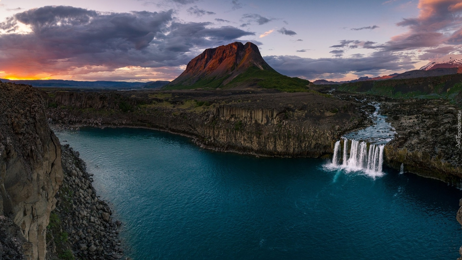 Edytor tapety: Wodospad wpadający do rzeki i góra w oddali