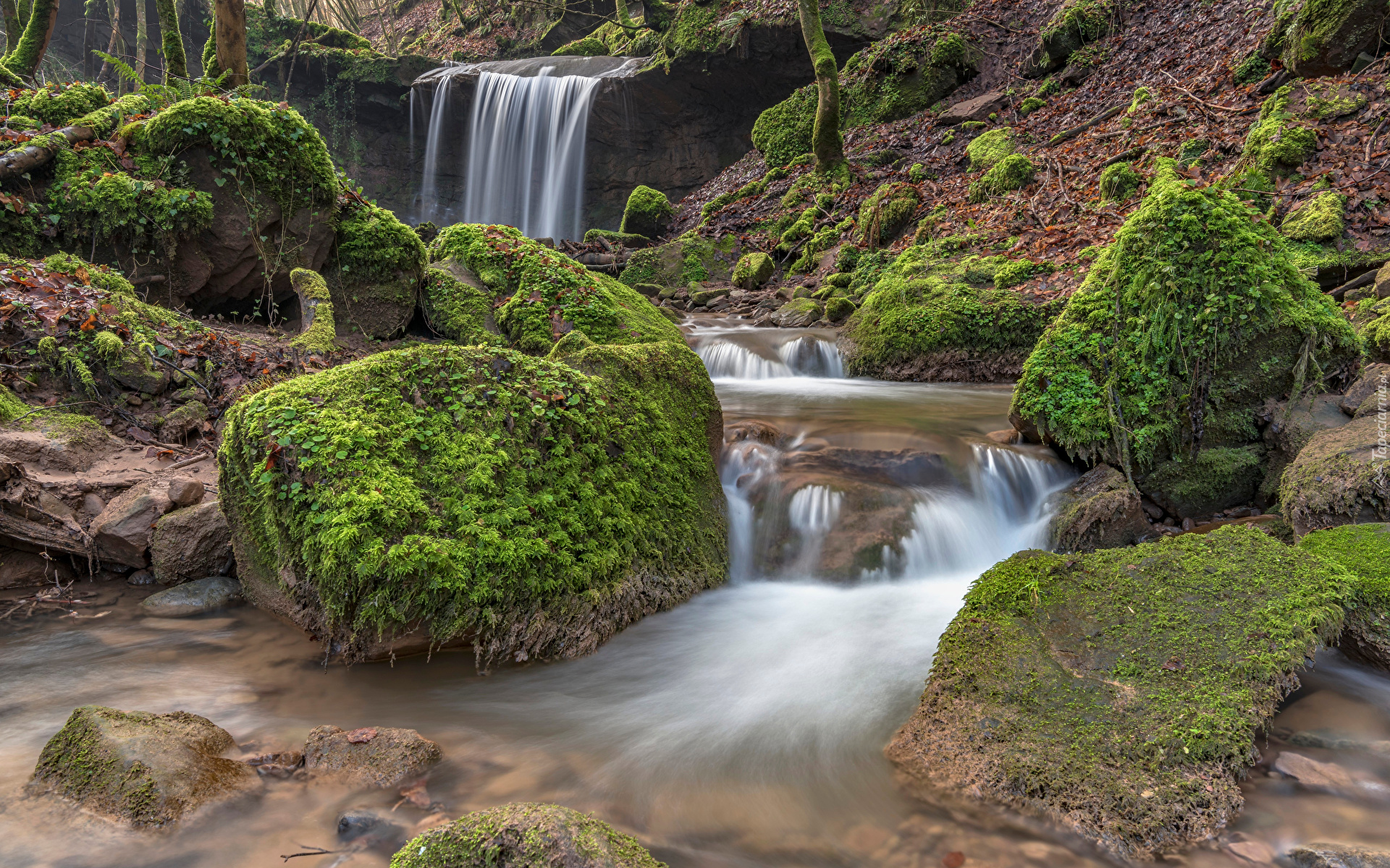 Edytor tapety: Omszałe skały na rzece przy wodospadzie