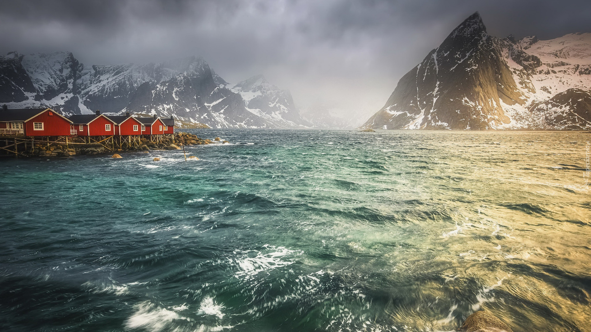 Edytor tapety: Czerwone domy na zamglonych norweskich Lofotach