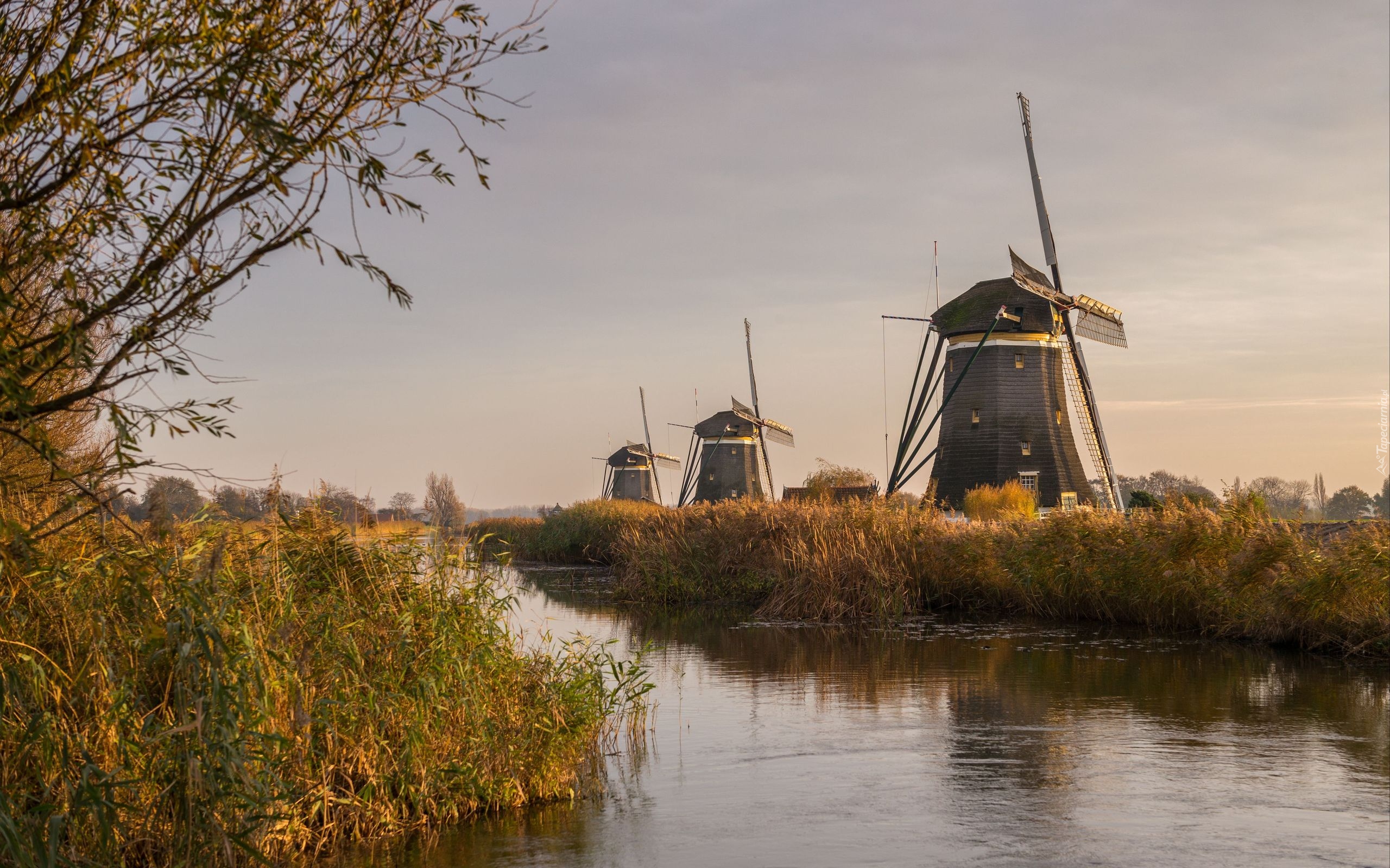 Edytor tapety: Wiatraki wśród jesiennych traw nad rzeką