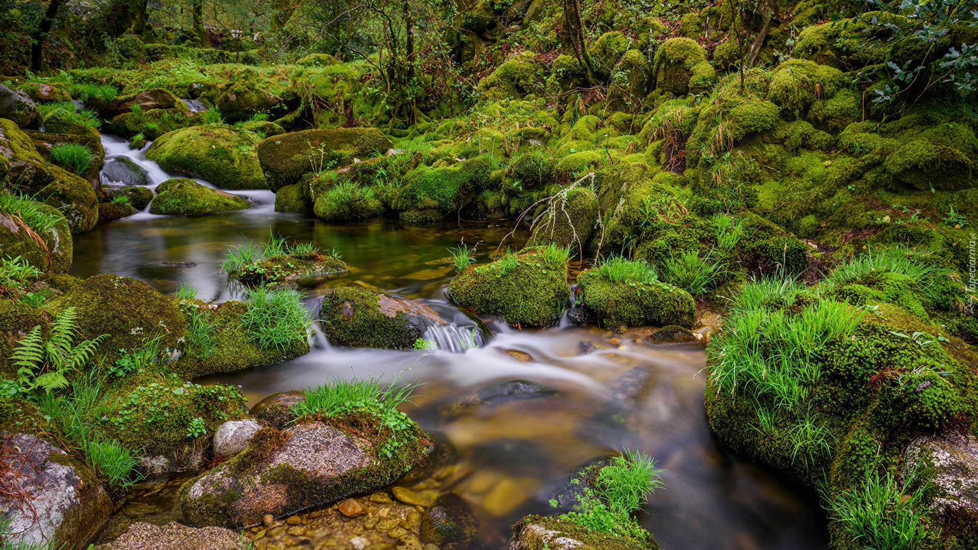 Edytor tapety: Trawa na omszałych kamieniach w potoku