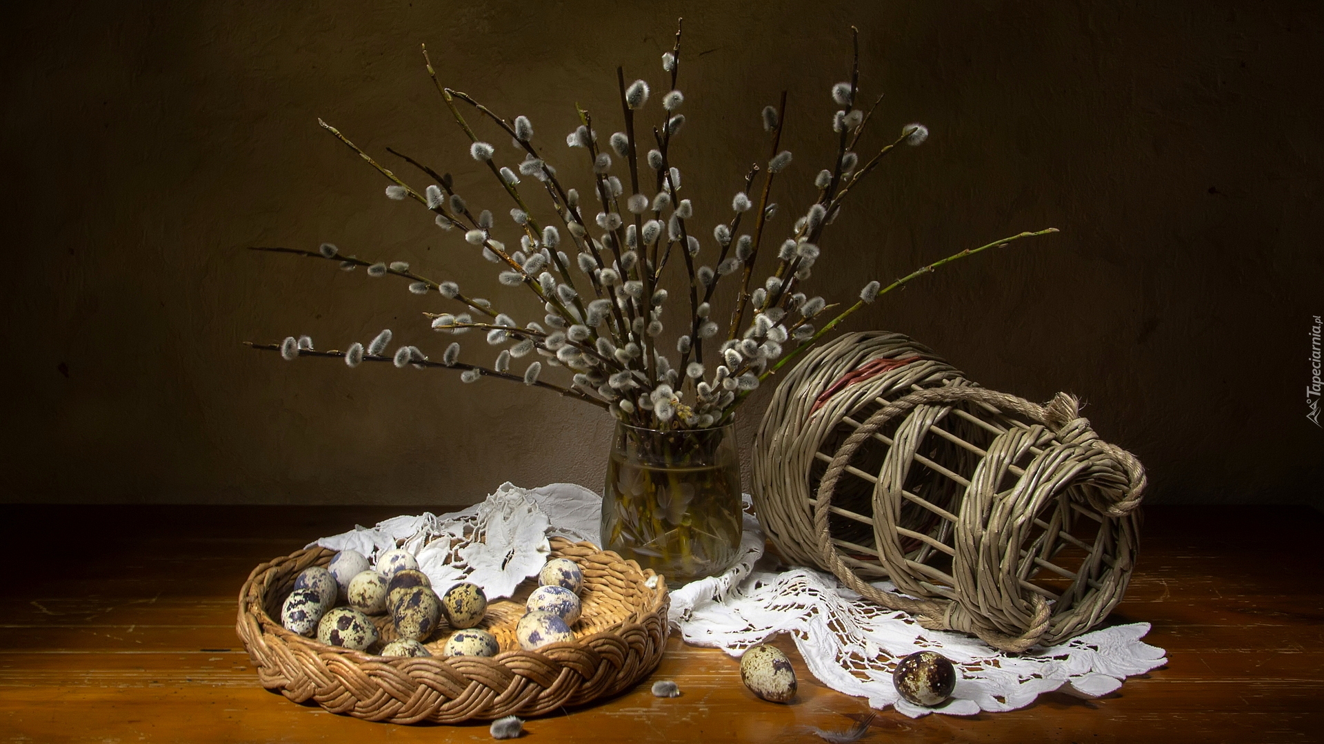 Edytor tapety: Jajeczka w koszyku obok bazi w wazonie