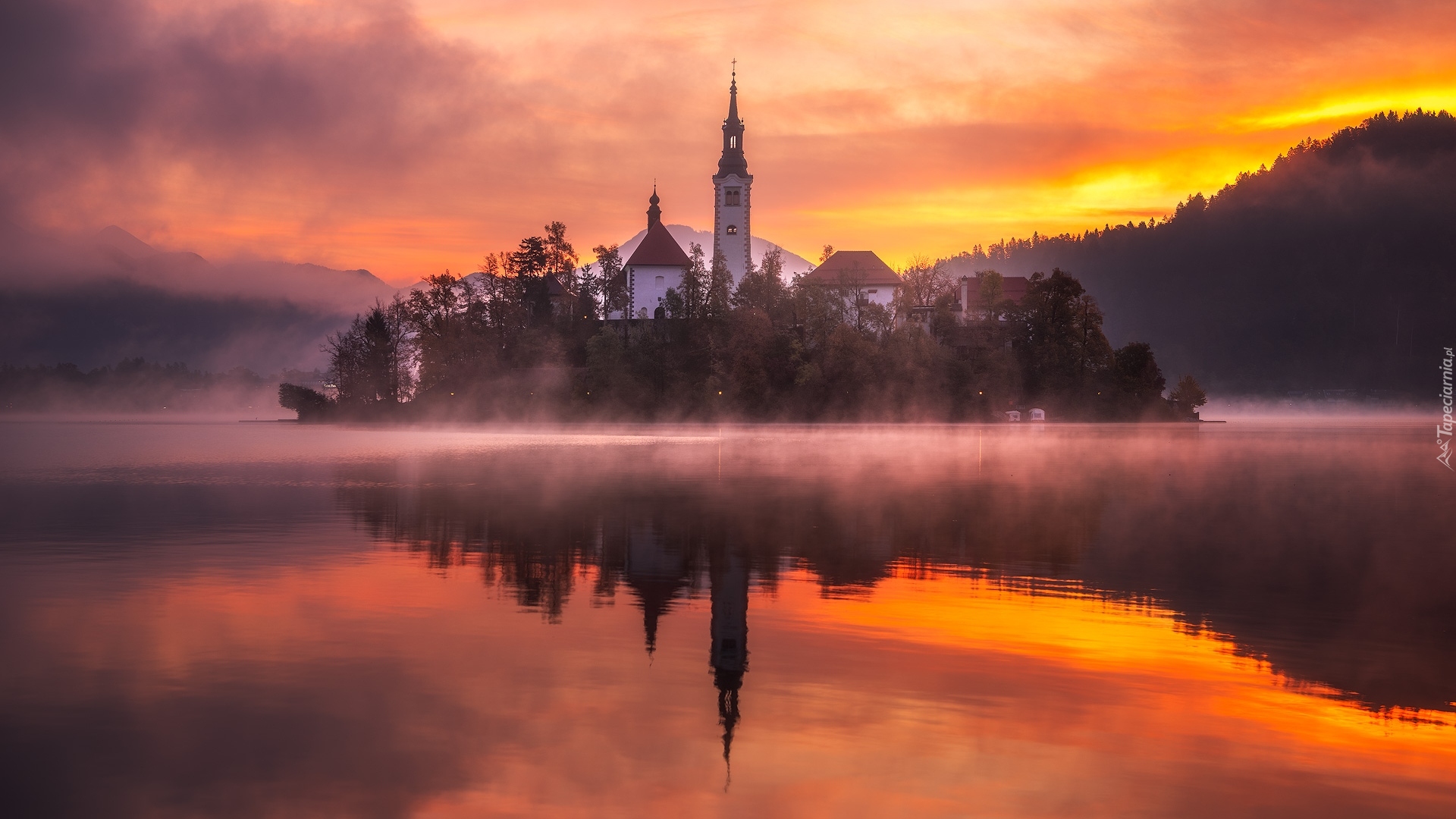 Edytor tapety: Kościół na wyspie Blejski Otok o zachodzie słońca