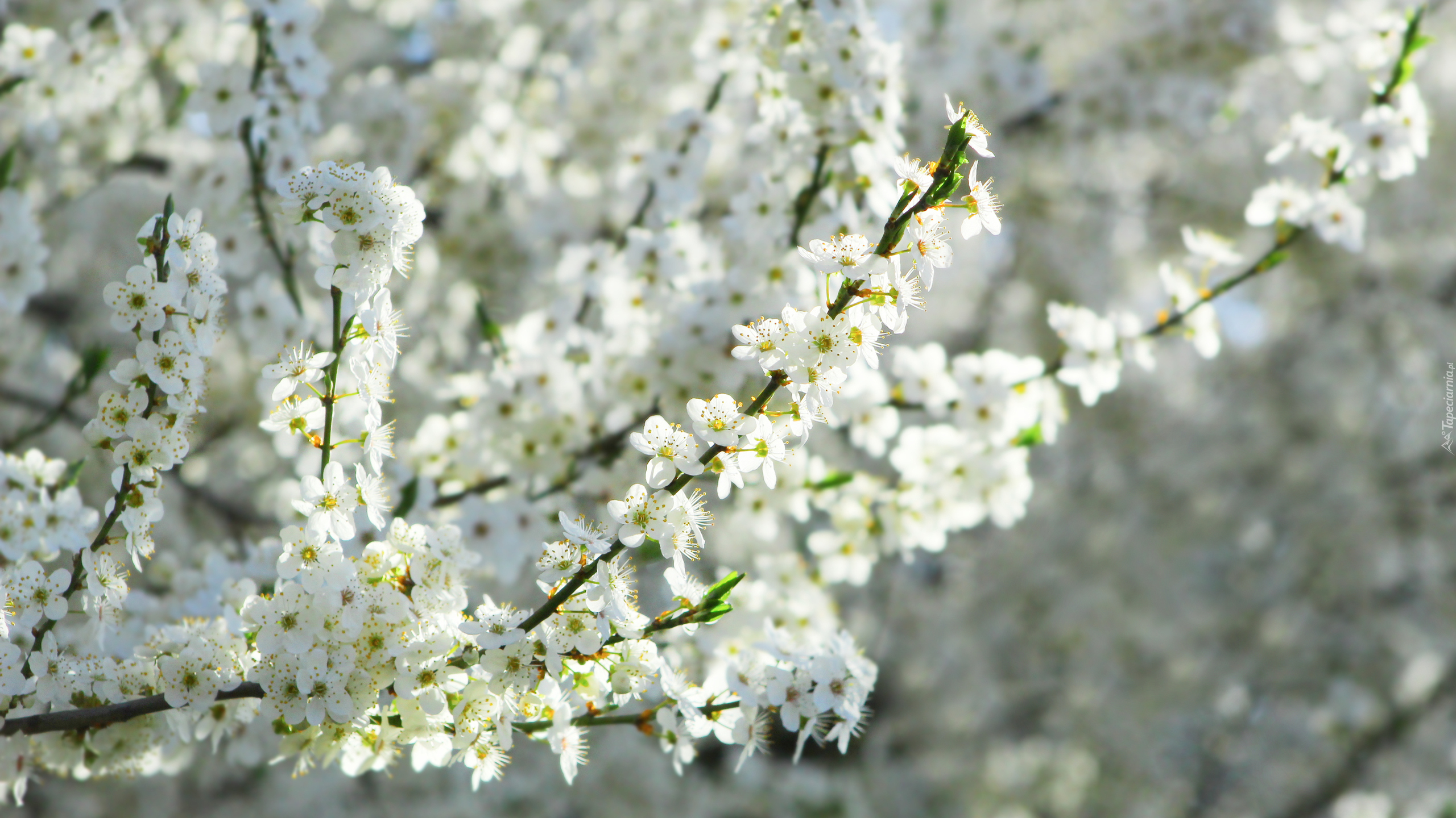 Edytor tapety: Gałązki drzewa owocowego z białymi kwiatami