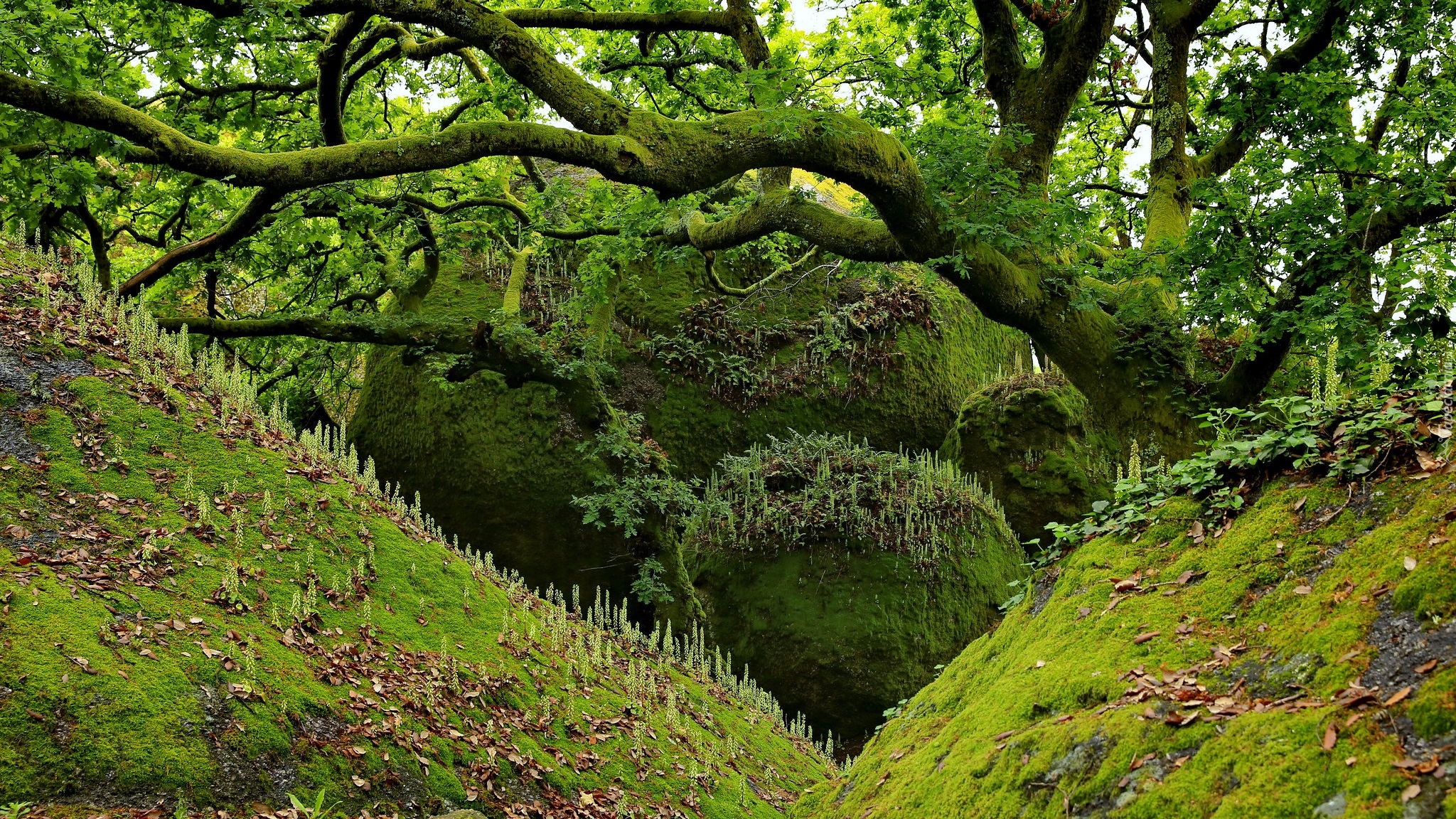 Edytor tapety: Rozłożyste omszałe drzewo na skarpie