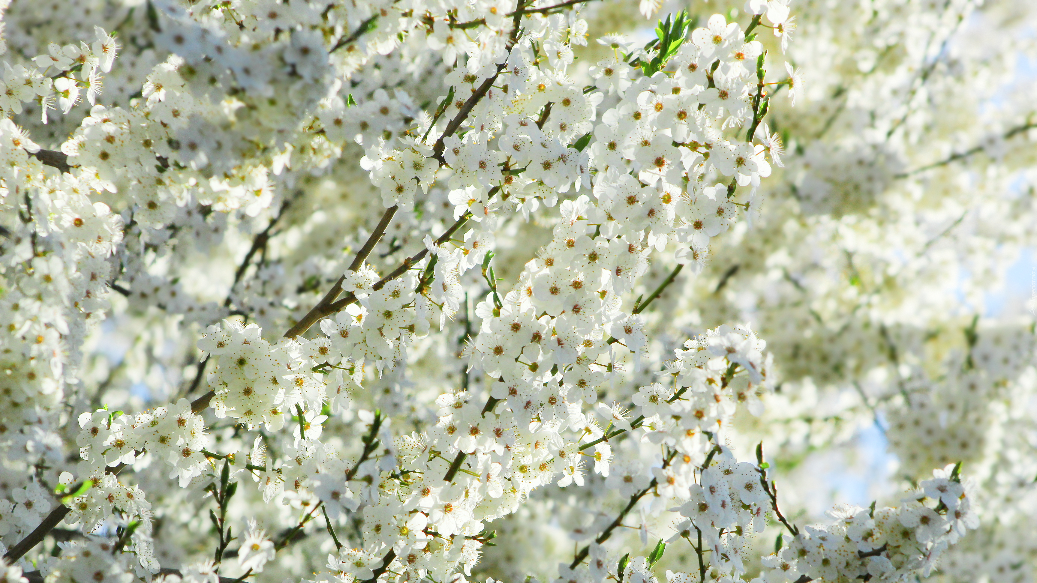 Edytor tapety: Kwitnące na biało drzewo owocowe w słońcu