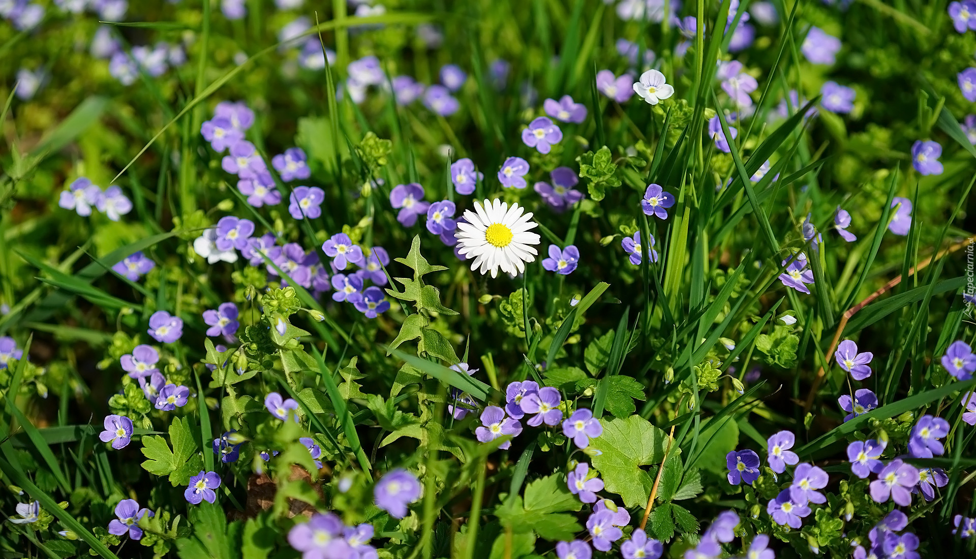 Edytor tapety: Stokrotka wśród kwiatów niebieskiego przetacznika