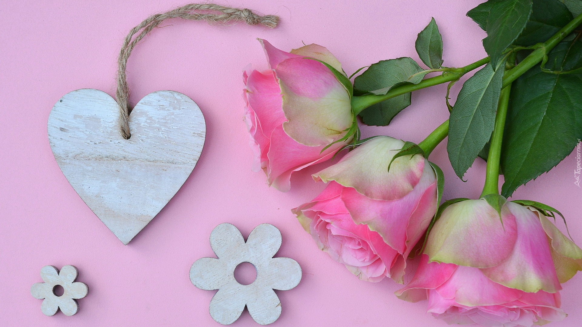 Edytor tapety: Róże obok drewnianego serca na różowym tle