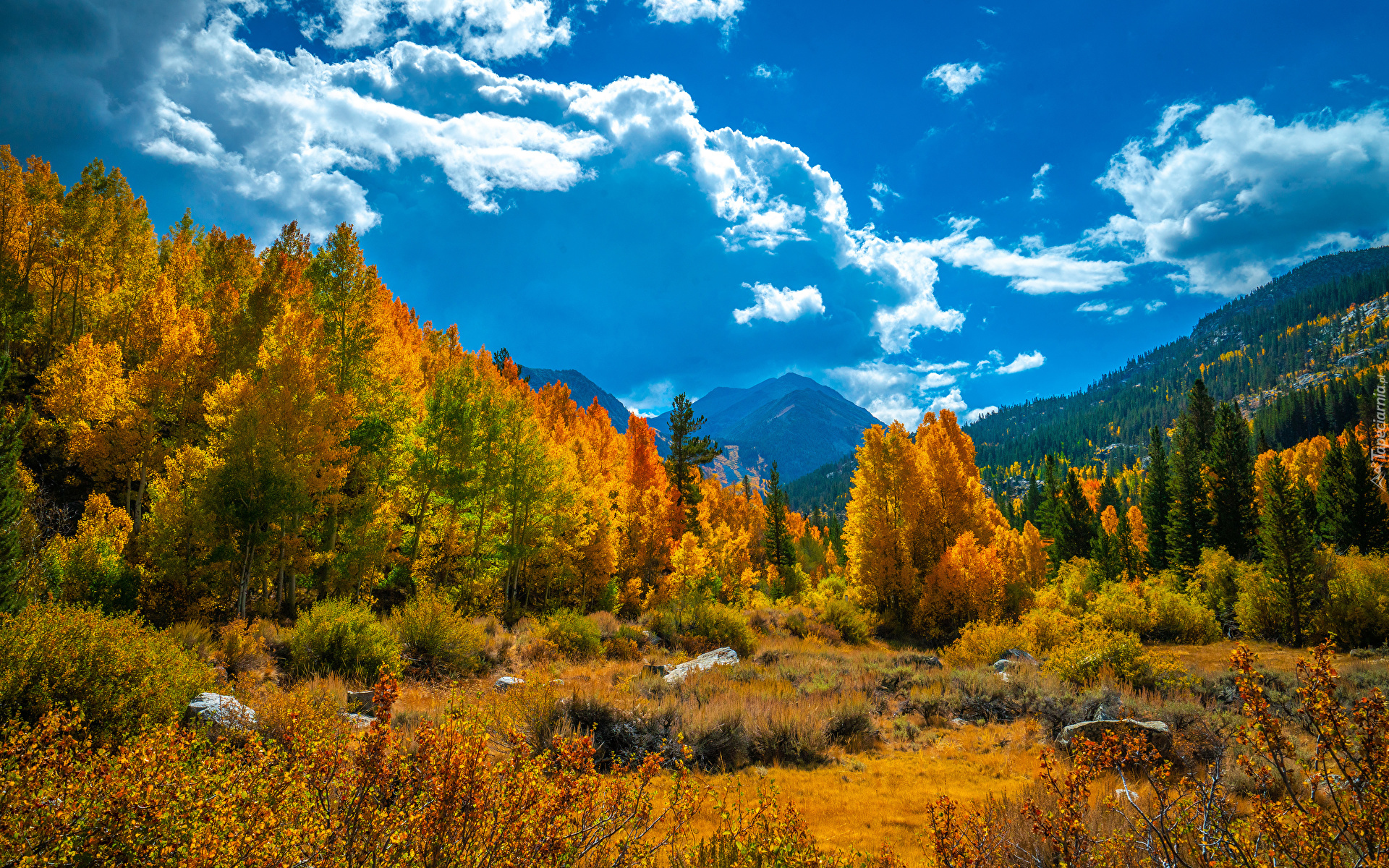 Edytor tapety: Rozświetlone jesienne drzewa i chmury nad górami