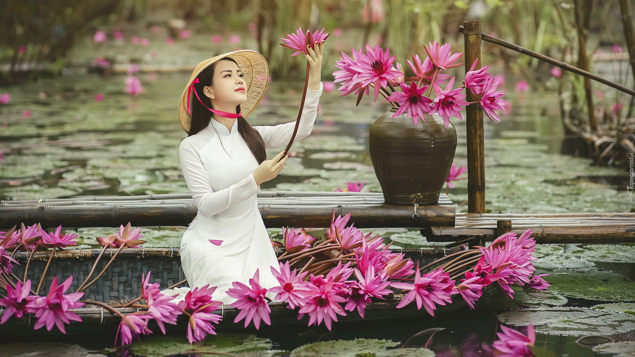 Edytor tapety: Azjatka w kapeluszu wśród lilii wodnych