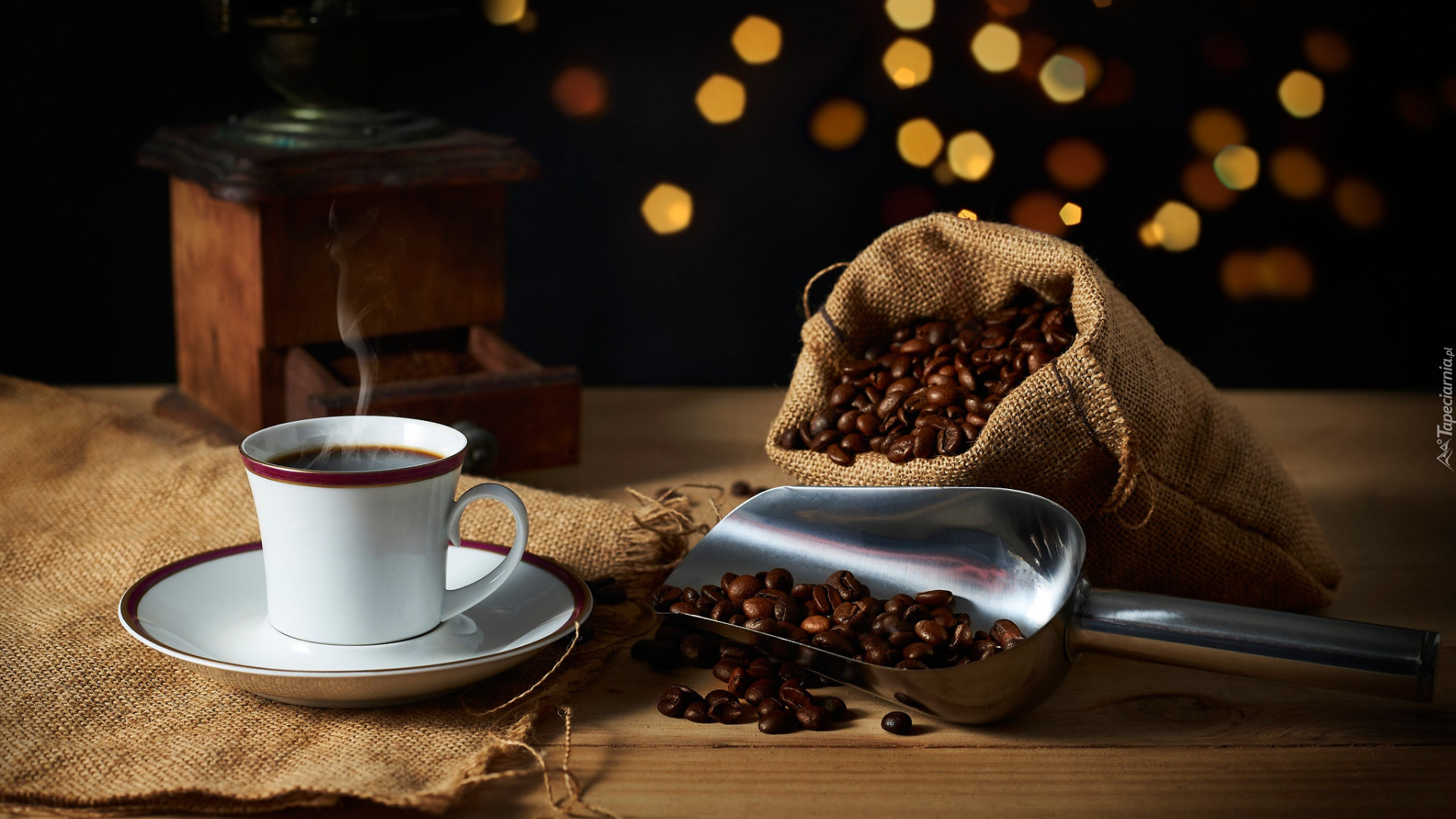 Edytor tapety: Ziarenka kawy na łopatce obok filiżanki z kawą