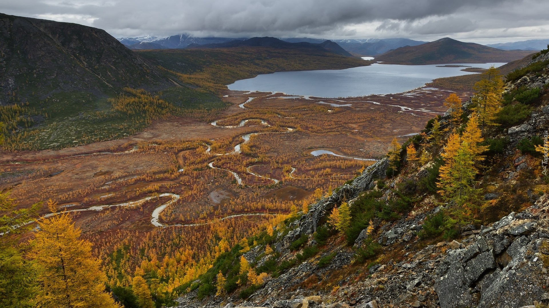 Edytor tapety: Kręte rzeki wpadające do jeziora w górach