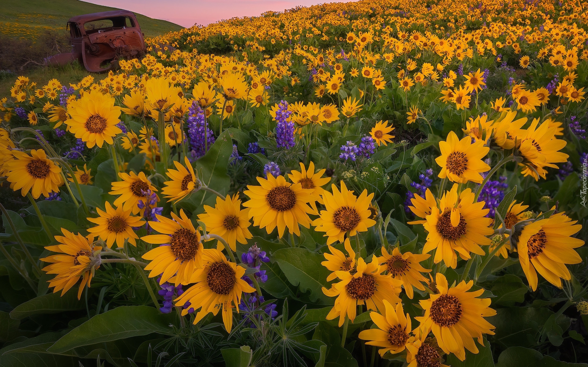 Edytor tapety: Wrak samochodu pośród kwiatów balsamorhizy