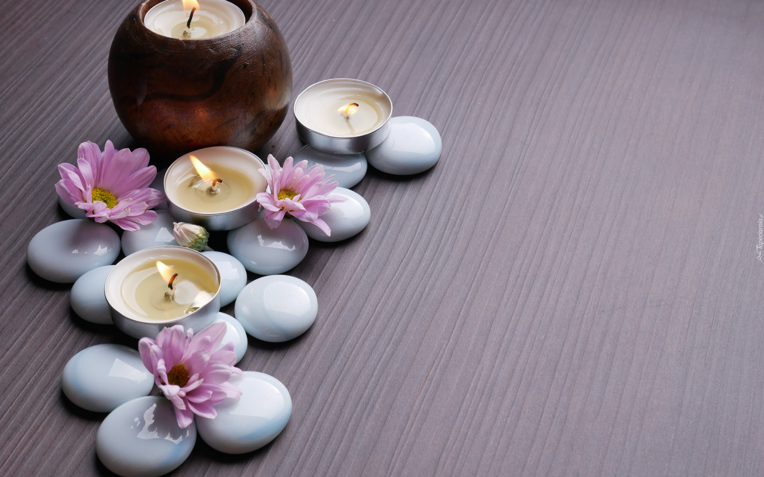 Edytor tapety: Chryzantemy na kamieniach i zapalone świeczki