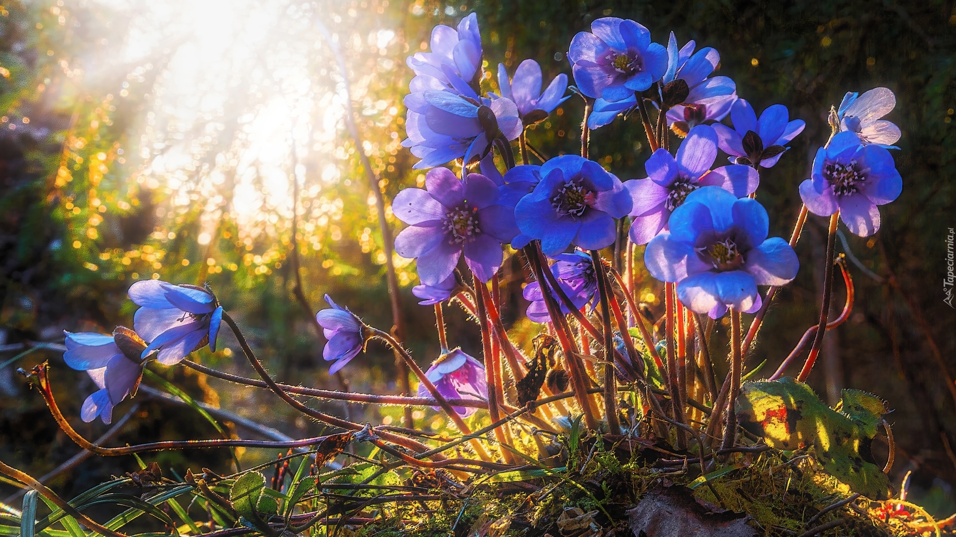 Edytor tapety: Rozświetlona kępka przylaszczek w trawie
