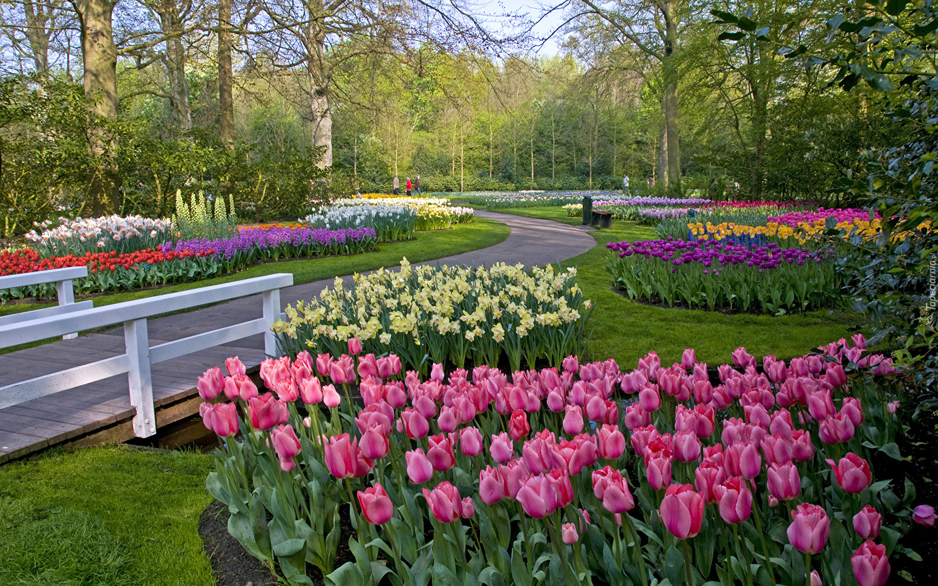 Edytor tapety: Klomby kolorowych tulipanów i żonkili w wiosennym parku