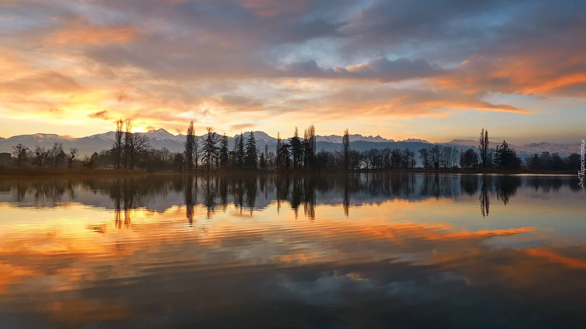 Edytor tapety: Odbicie kolorowych chmur i drzew w jeziorze