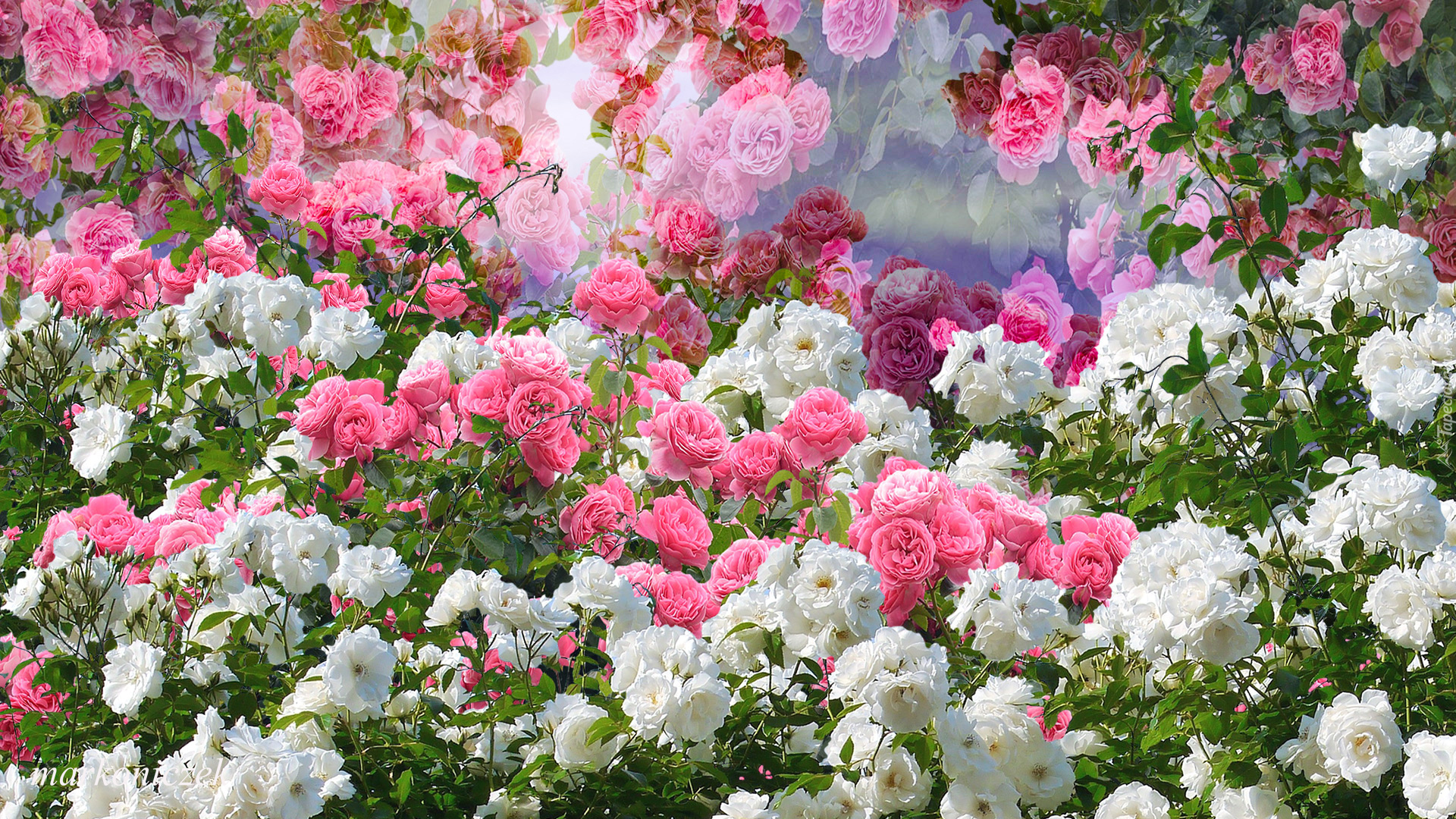 Edytor tapety: Białe i różowe róże w zbliżeniu
