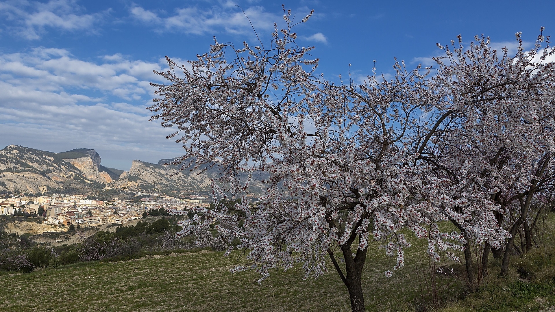 Edytor tapety: Kwitnące drzewa owocowe na tle miasta w dolinie