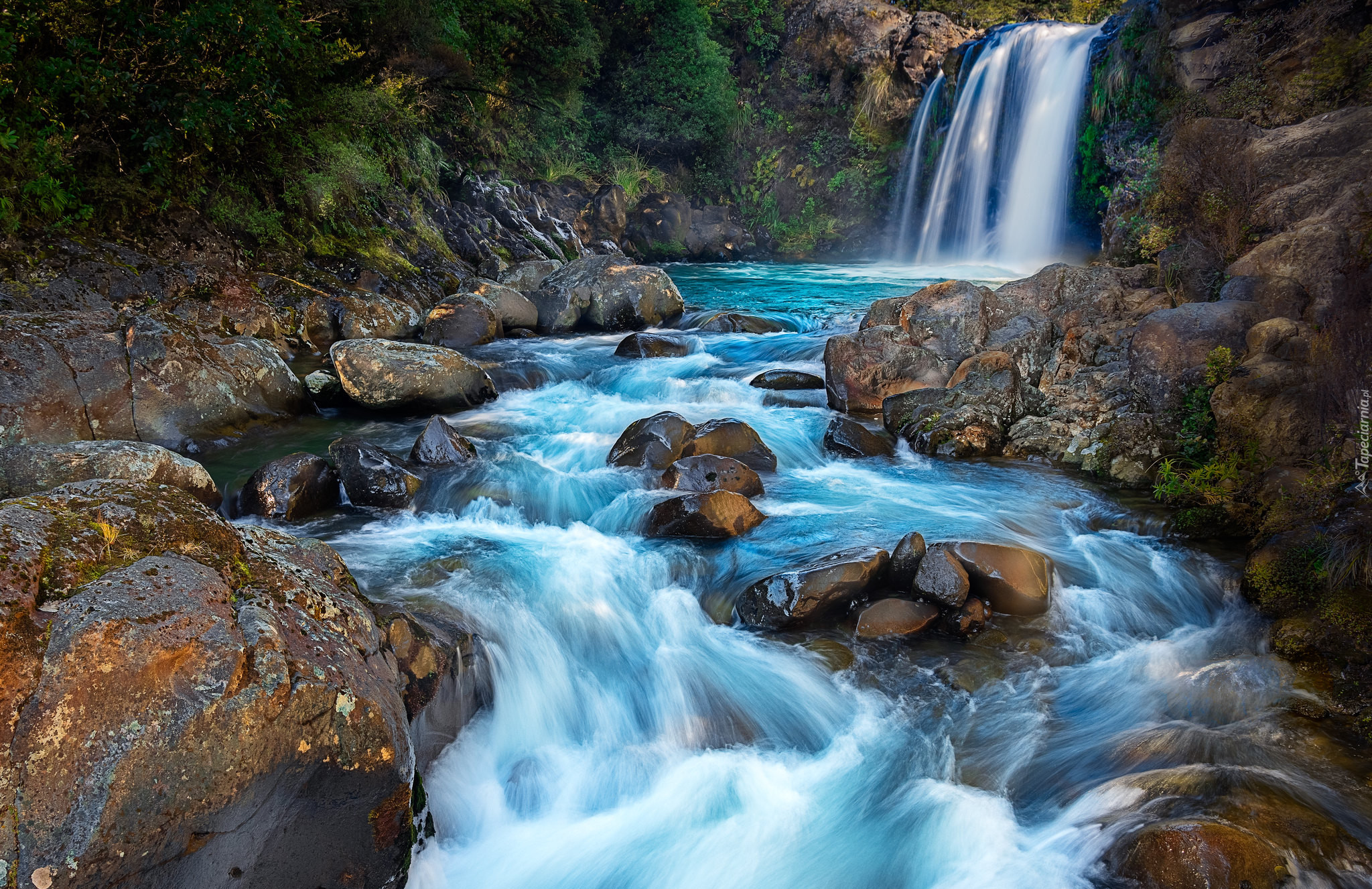 Edytor tapety: Wodospad Tawhai Falls wpadający do rwącej rzeki