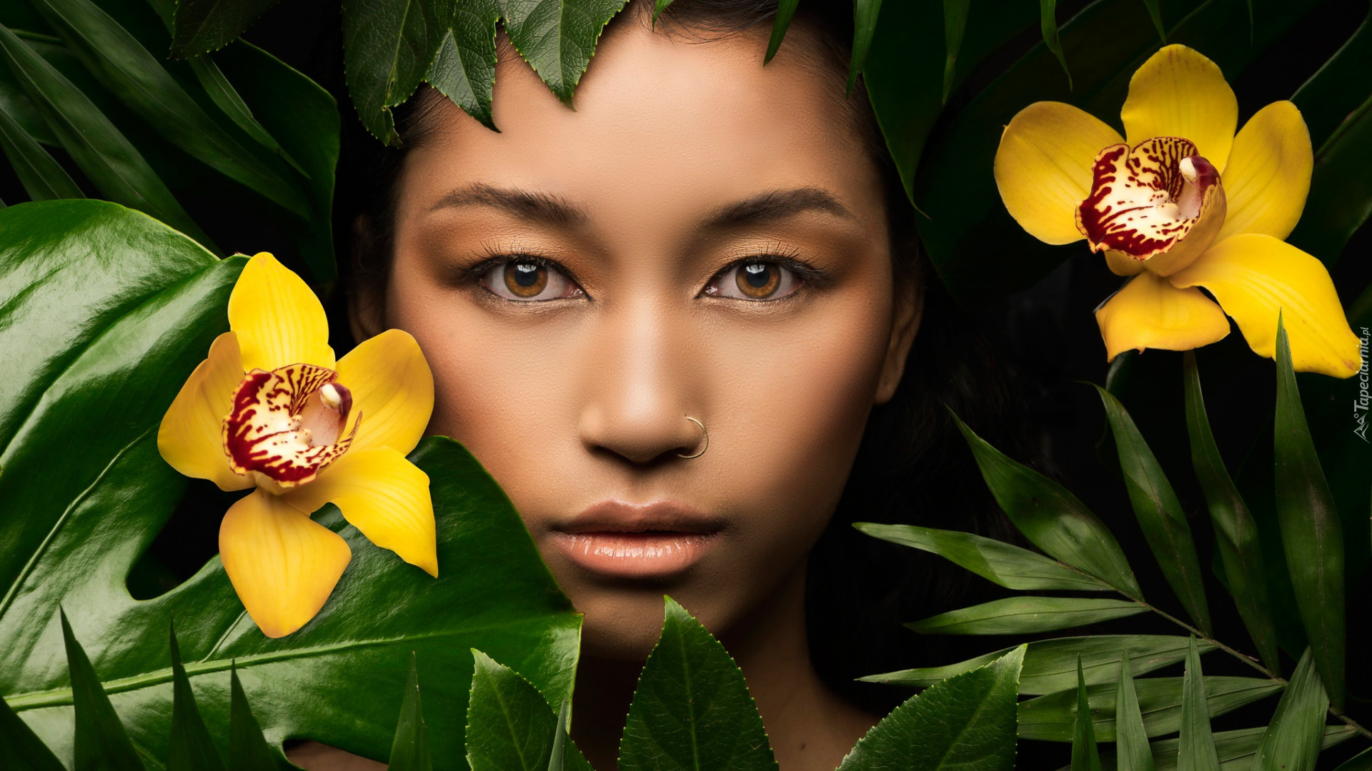 Edytor tapety: Dziewczyna pośród zielonych liści i storczyków