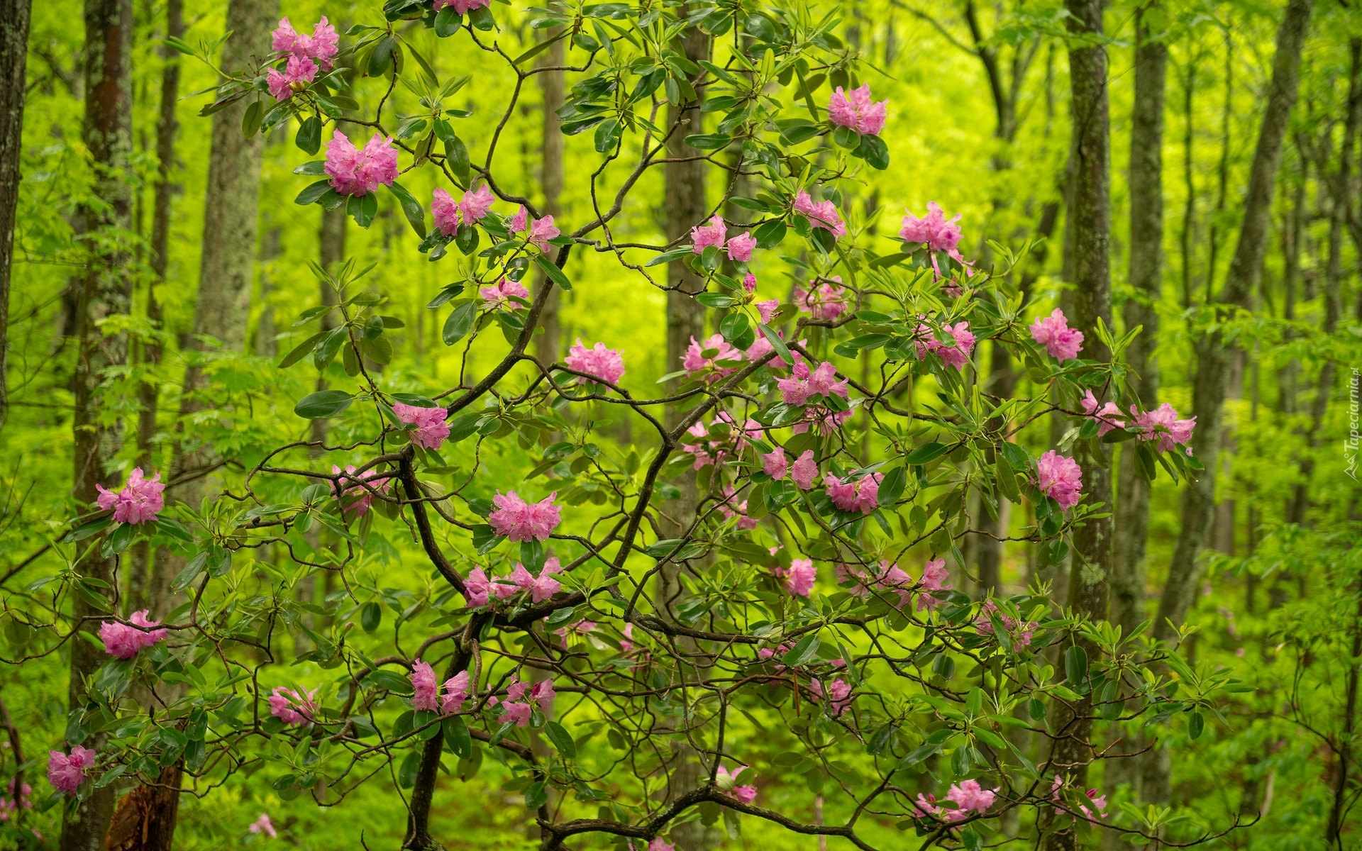 Edytor tapety: Różowe kwiaty różanecznika w zielonym lesie