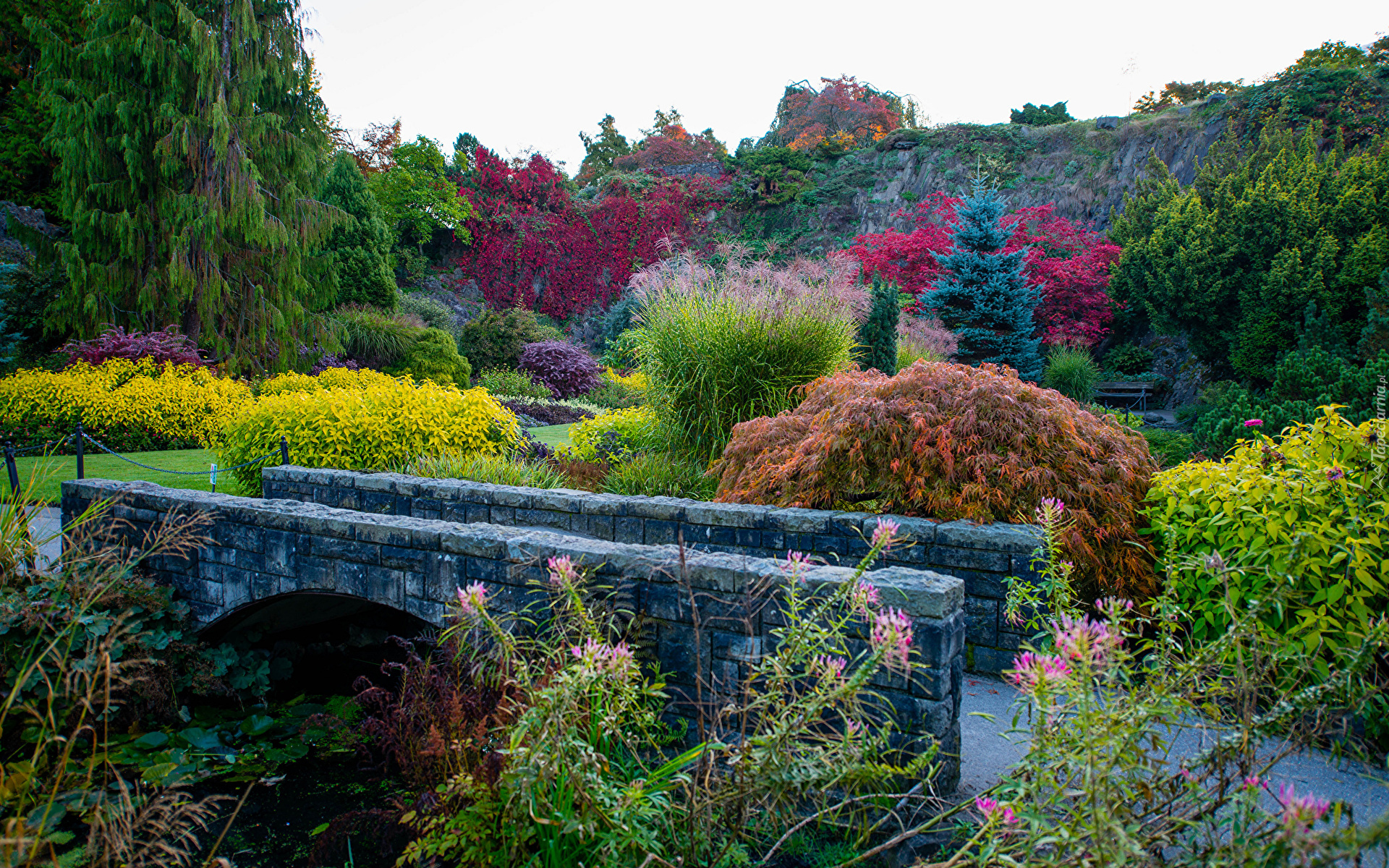 Edytor tapety: Mostek i kolorowe rośliny w parku