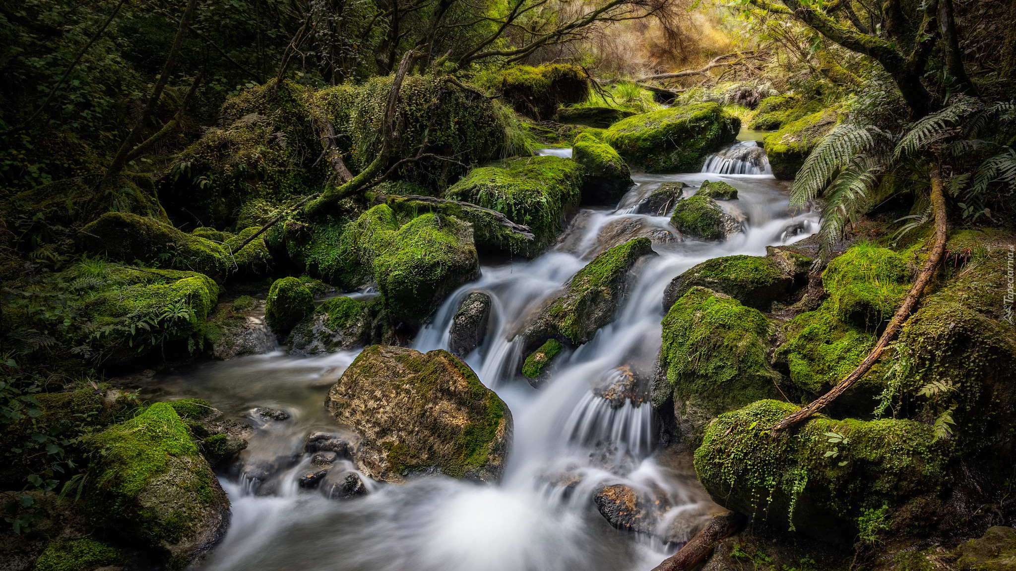 Edytor tapety: Omszone kamienie obok strumienia Kareaara w Nowej Zelandii