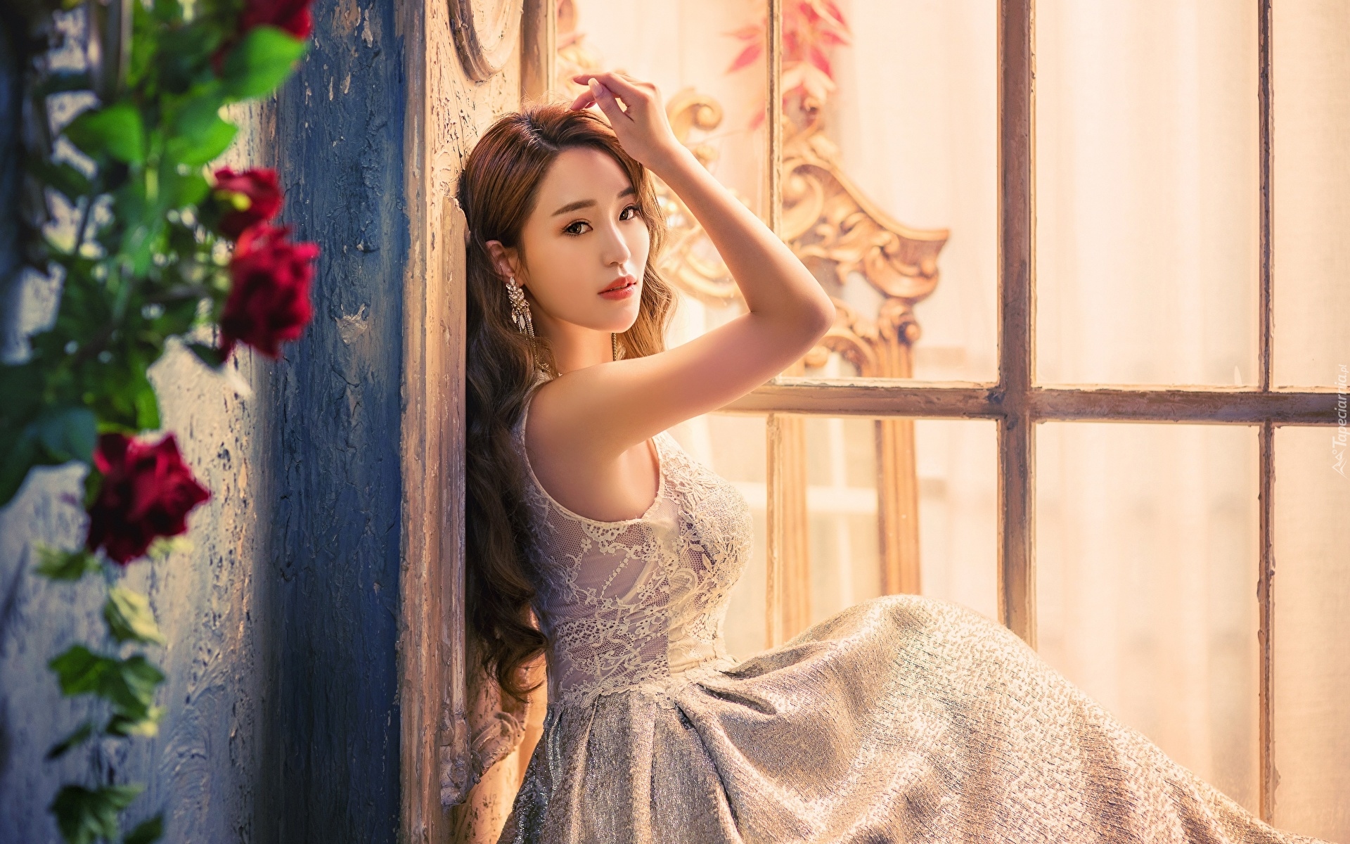 Edytor tapety: Kobieta w eleganckiej sukni przy oknie