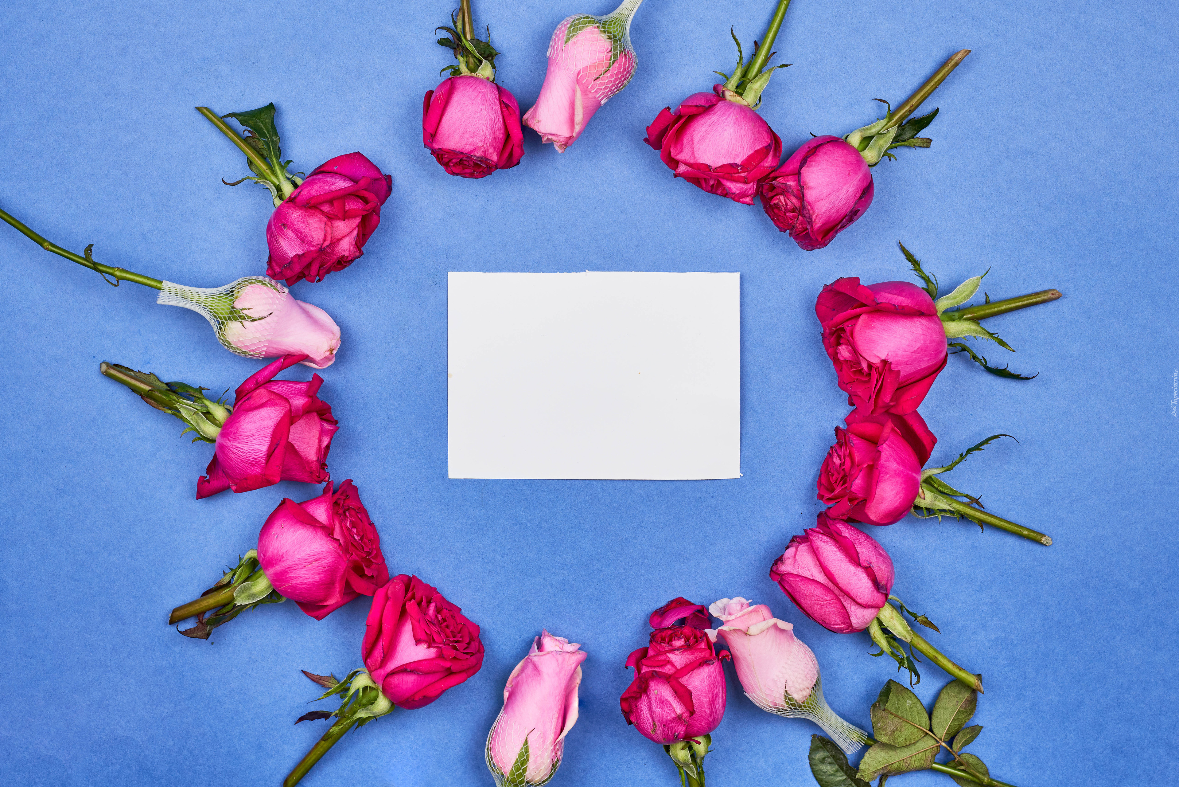 Edytor tapety: Biała kartka otoczona różami na niebieskim tle