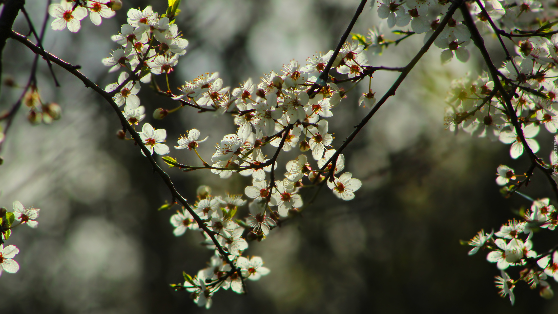 Edytor tapety: Gałązki z białymi kwiatami drzewa owocowego
